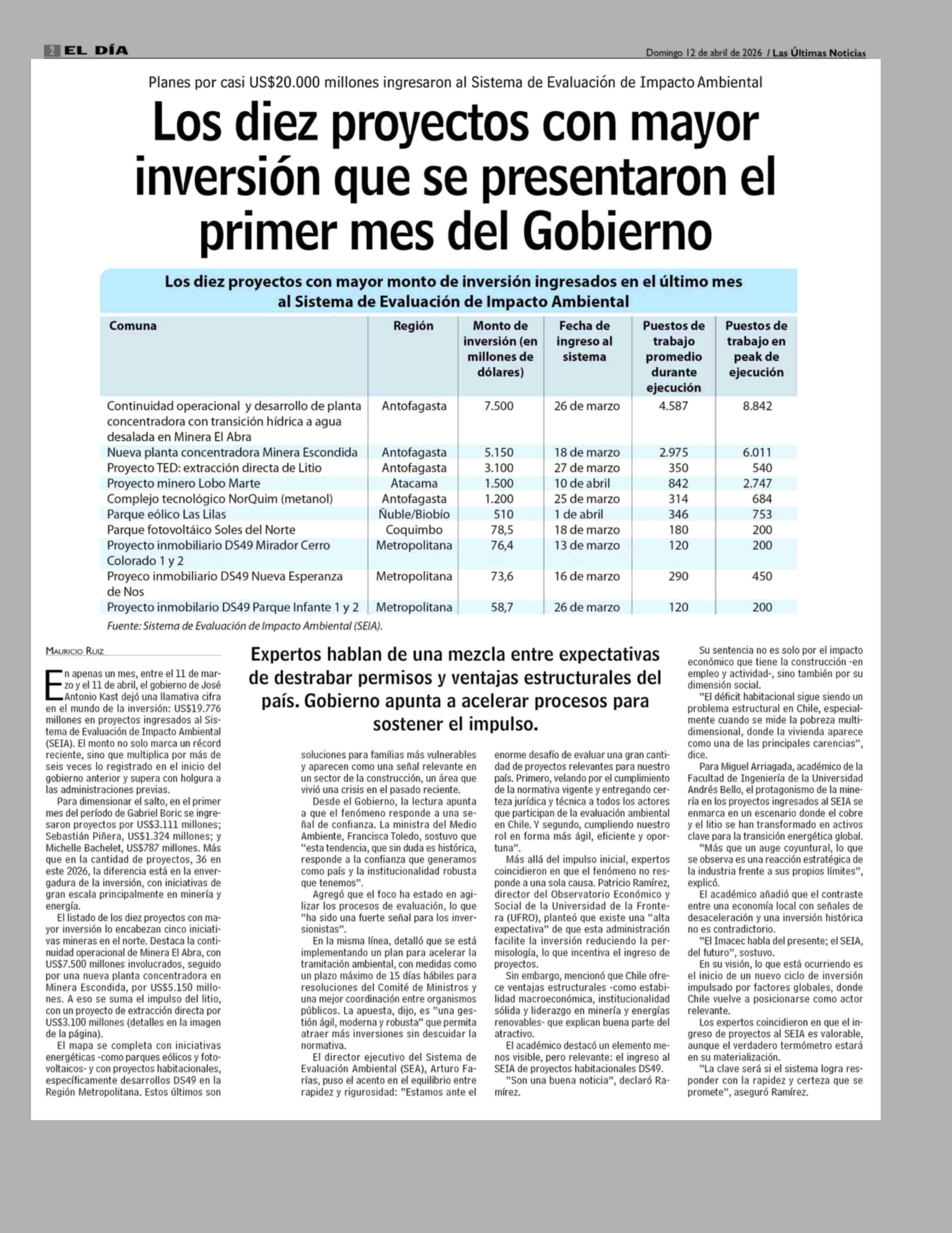 Título: Los diez proyectos con mayor inversión que se presentaron el primer mes del Gobierno