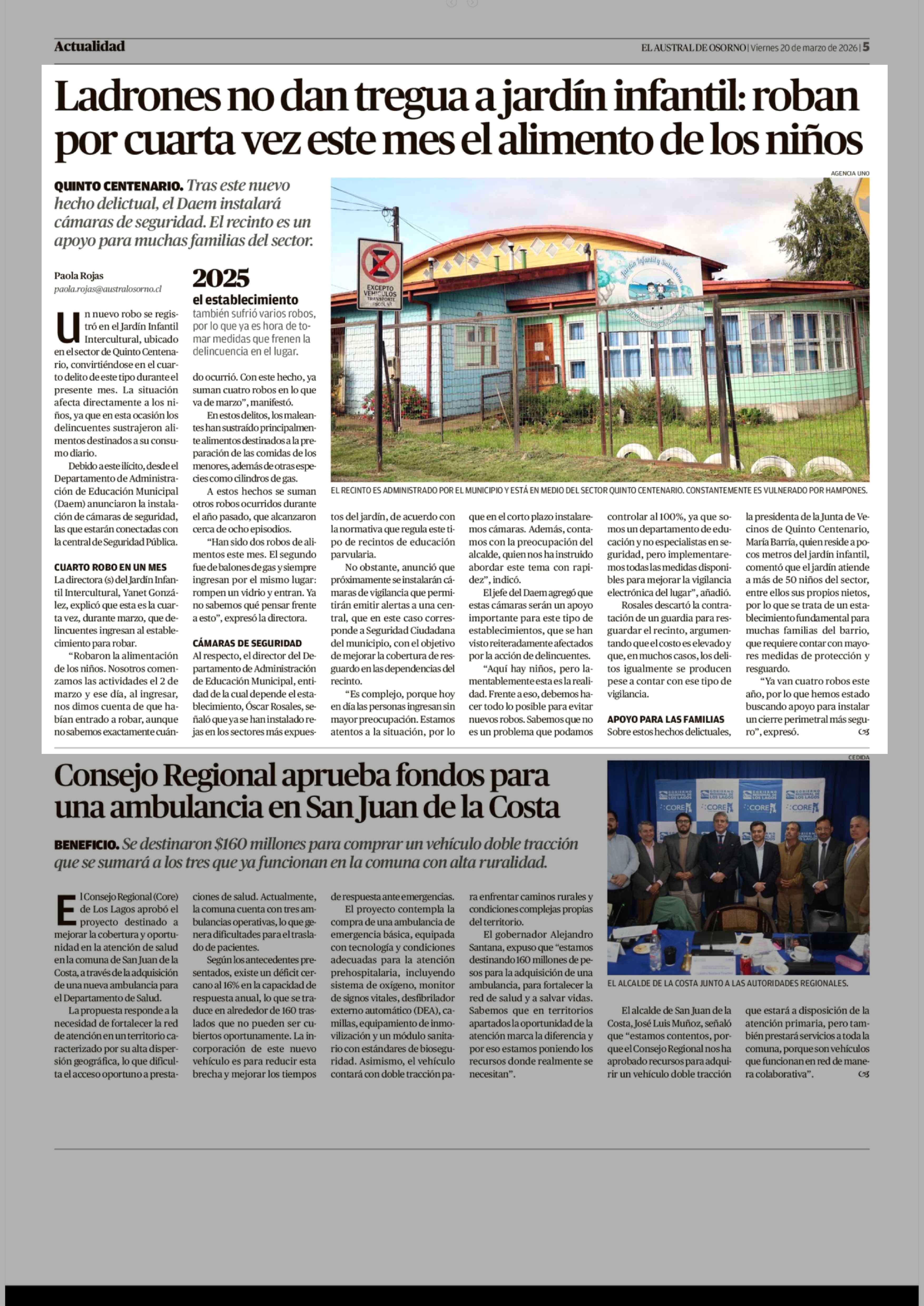 Ladrones no dan tregua a jardín infantil: roban por cuarta vez este mes el alimento de los niños 20-03-2026 El Austral de Osorno |