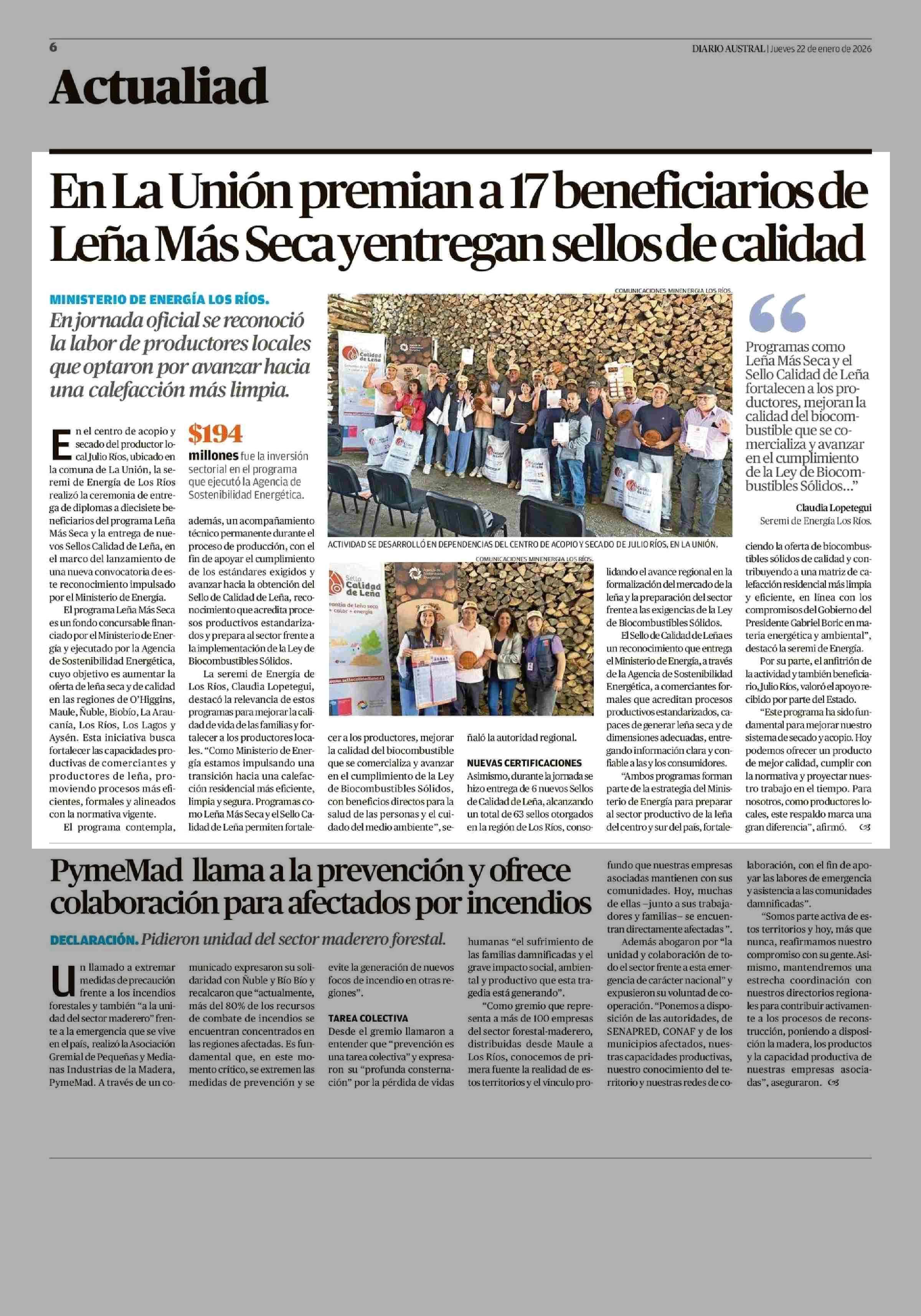 En La Unión premian a 17 beneficiarios de Leña Más Seca yentregan sellos de calidad 22-01-2026 Diario Austral Región de Los Ríos |
