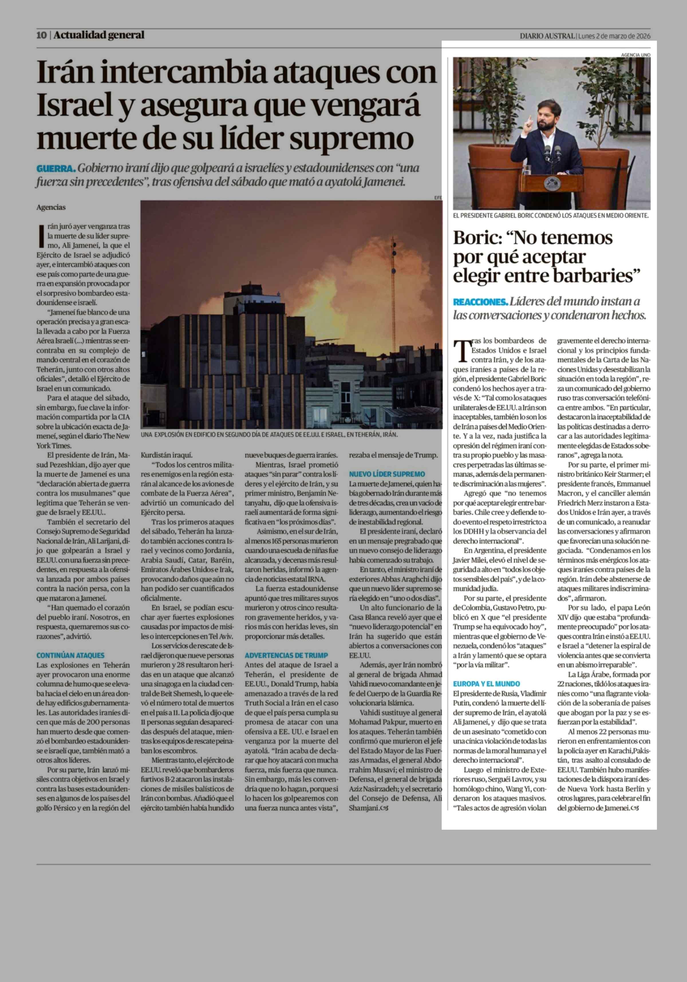 Boric: "No tenemos por qué aceptar elegir entre barbaries" 02-03-2026 Diario Austral Región de Los Ríos |
