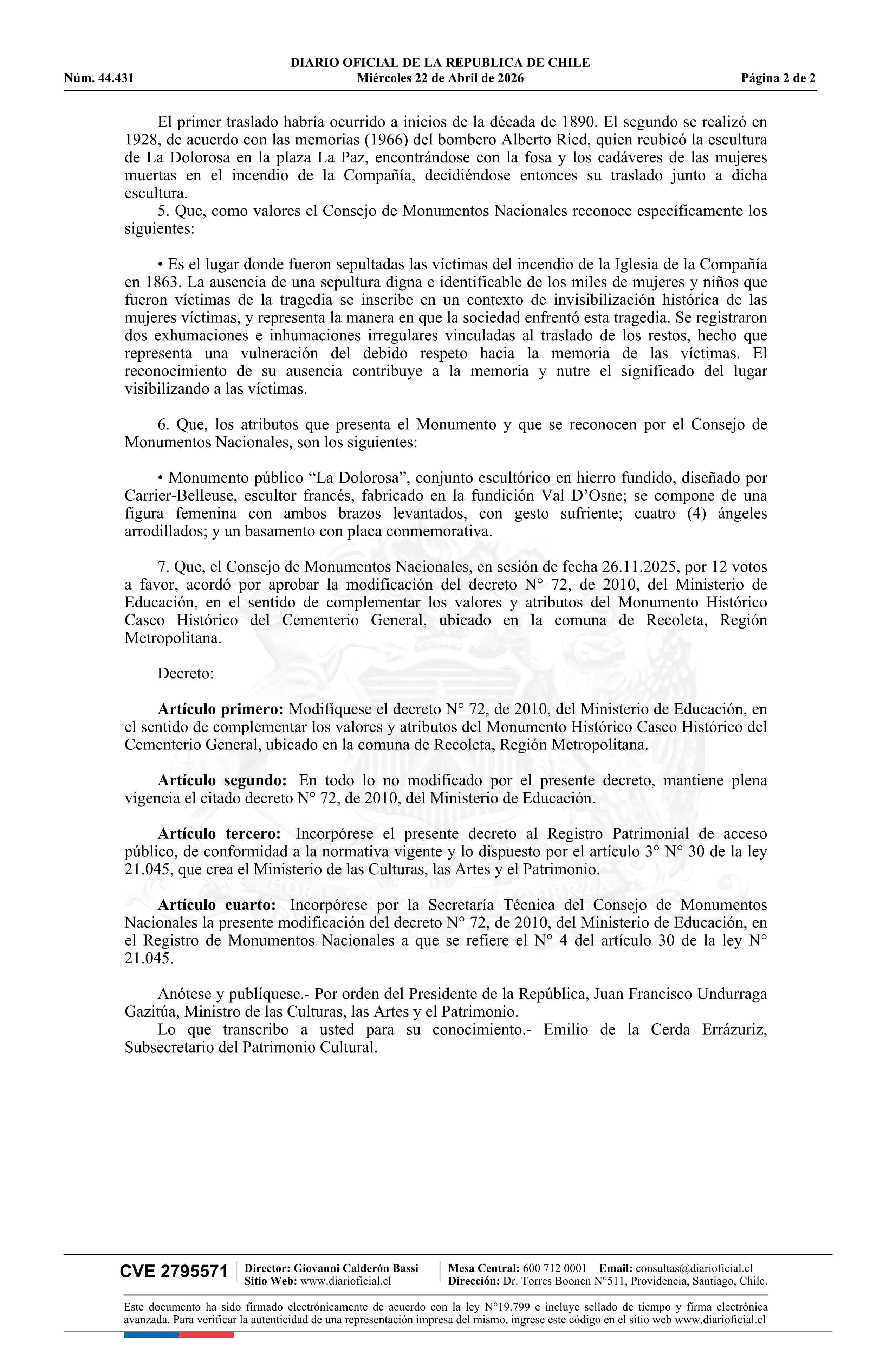 Título: Decreto exento número 58, de 2026.- Modifica decreto N° 72, de 2010, del Ministerio de Educación, que declara Monumento Nacional, en la categoría de Monumento Histórico, al Casco Histórico del Cementerio General ubicado en la comuna de Recoleta, Región Metropolitana