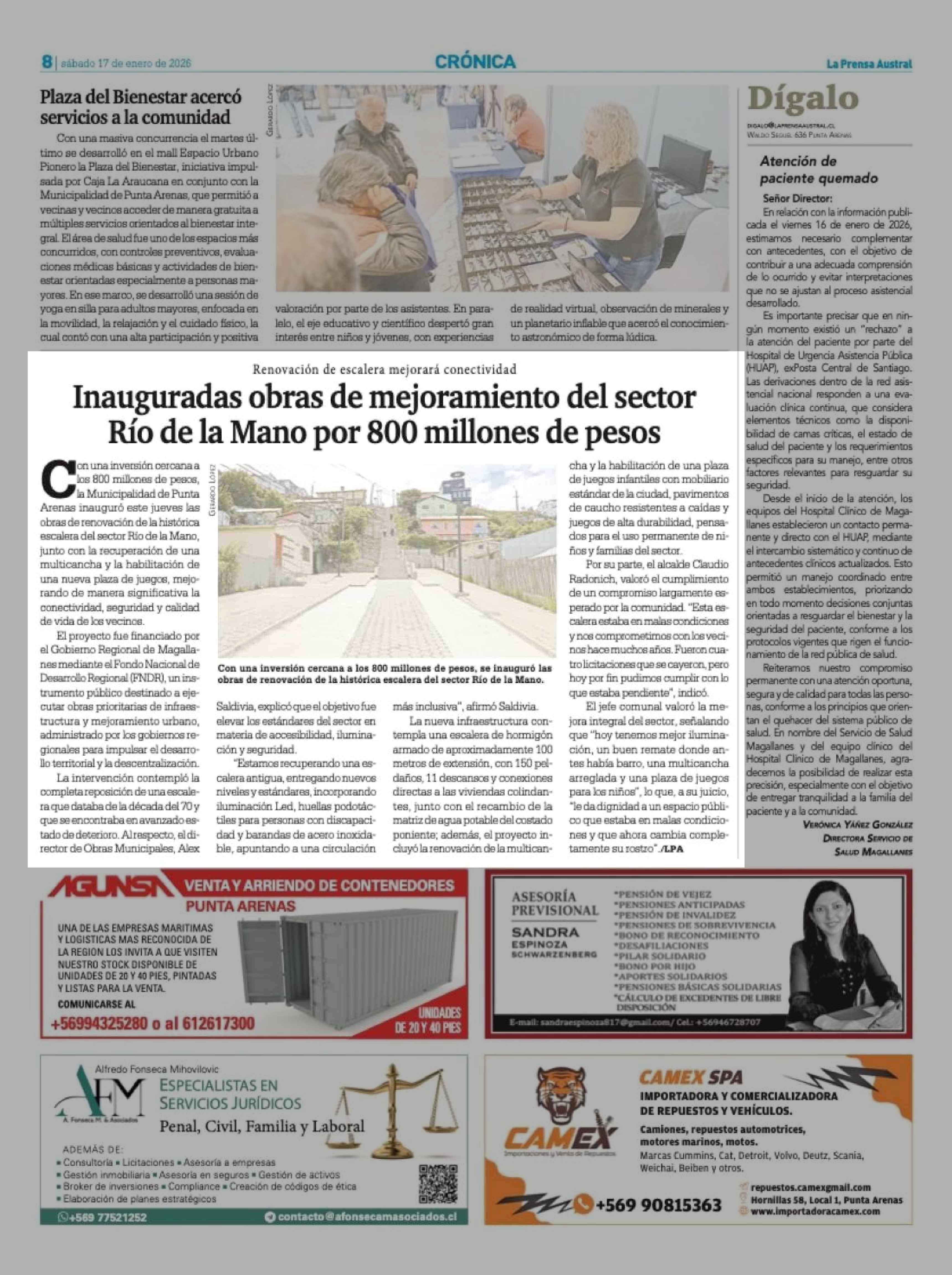 | Fecha: | 17-01-2026 | Sector: | Noticia general | Región: | Región de Magallanes y de la Antártica Chilena |
