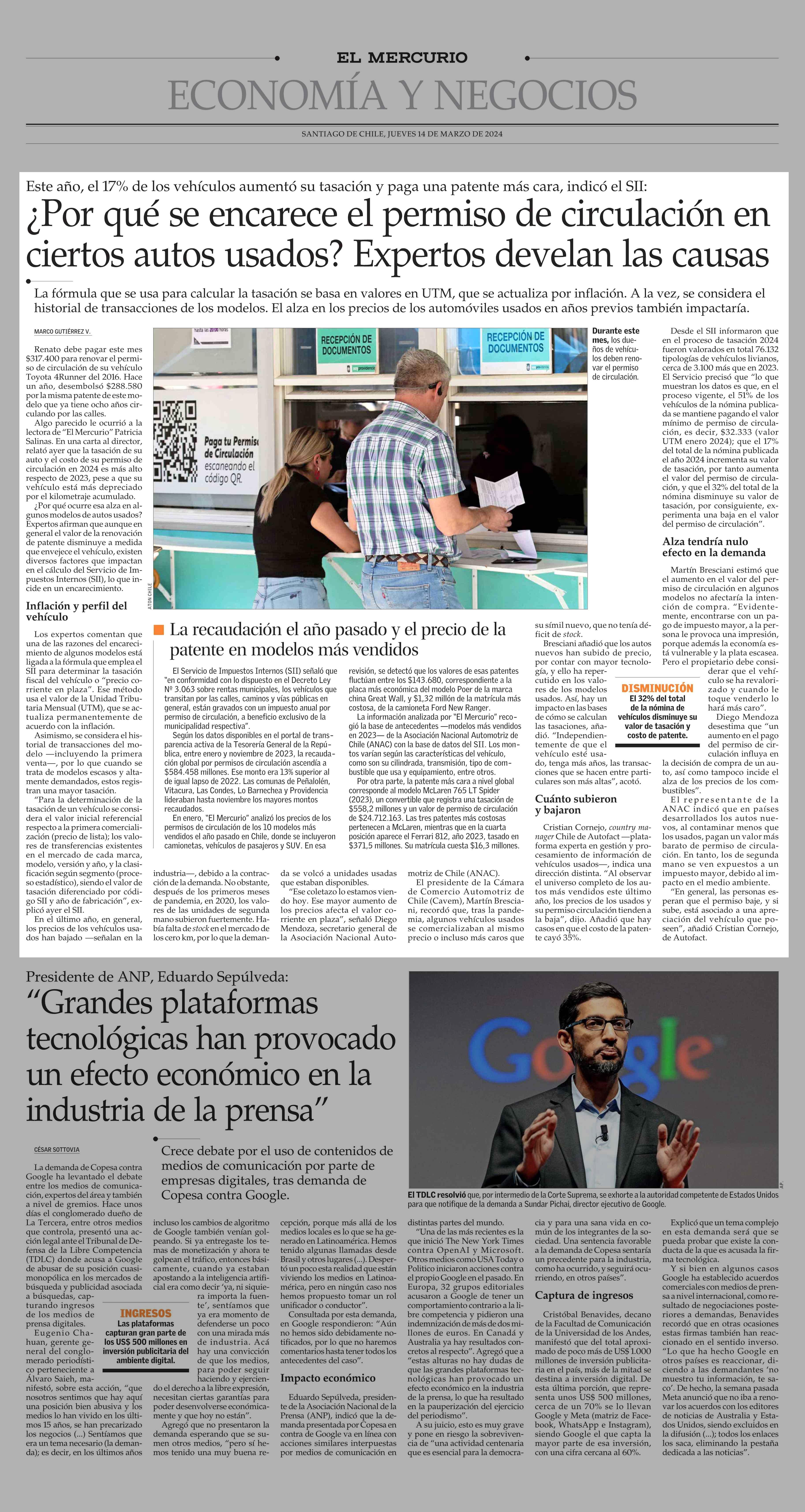 ¿Por qué se encarece el permiso de circulación en ciertos autos usados? Expertos develan las causas 14-03-2024 El Mercurio |