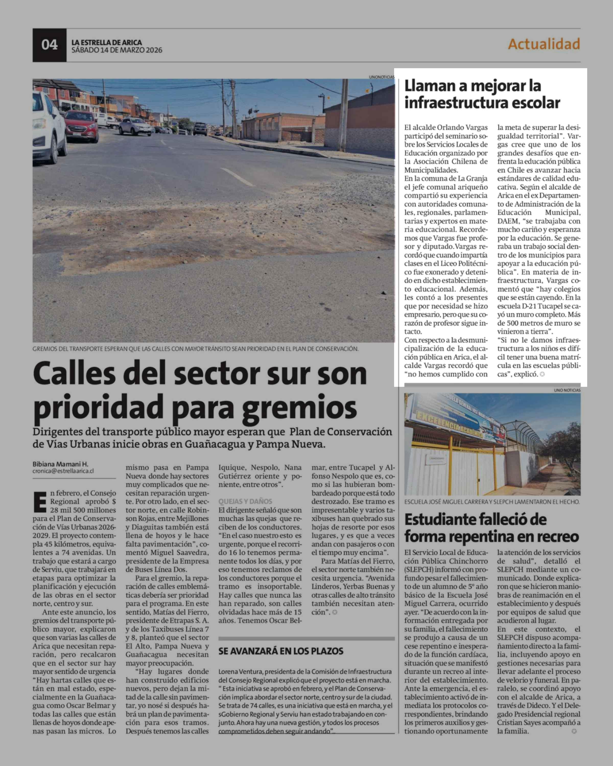 Llaman a mejorar la infraestructura escolar 14-03-2026 La Estrella de Arica |