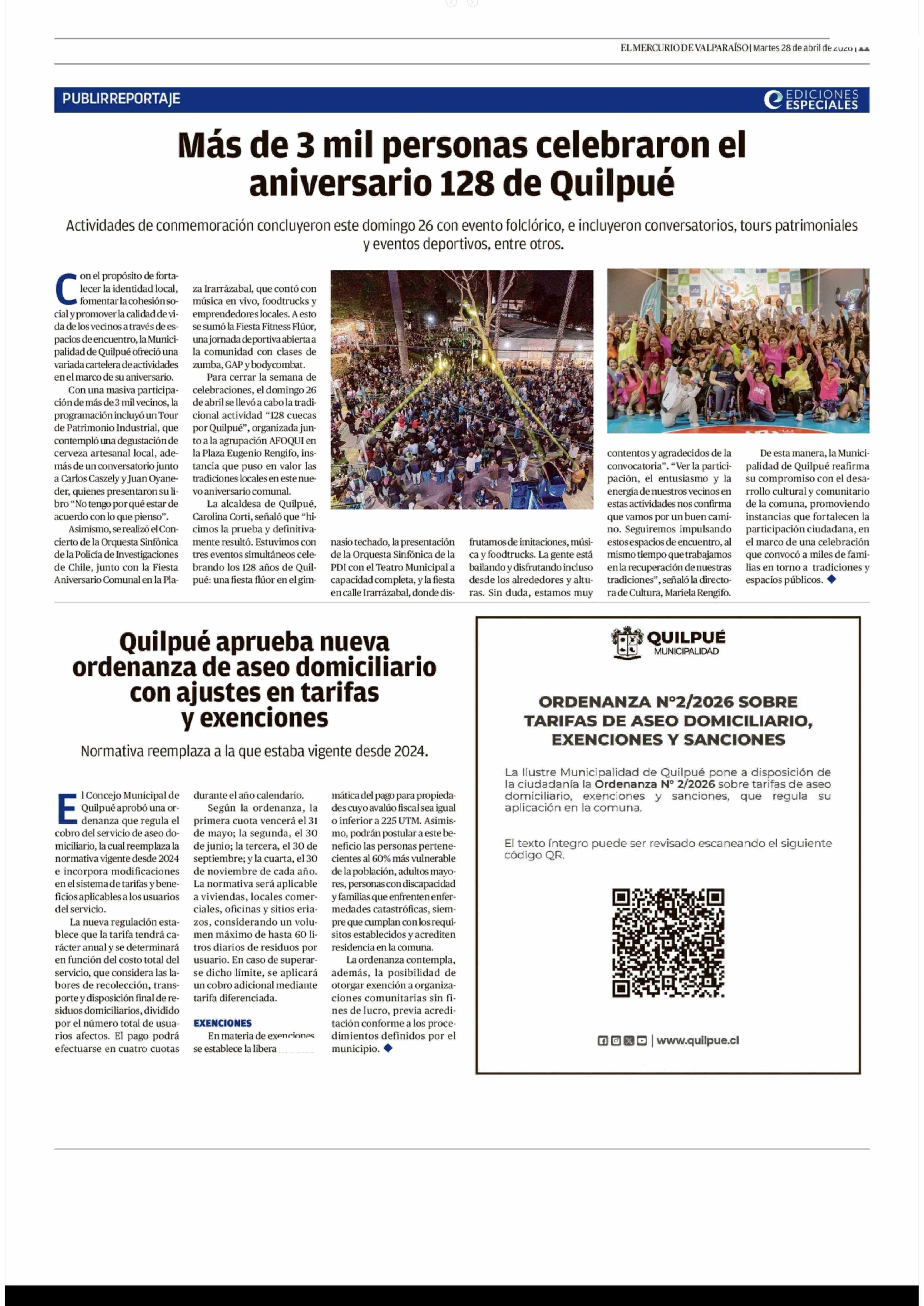 Quilpué aprueba nueva ordenanza de aseo domiciliario con ajustes en tarifas y exenciones 28-04-2026 El Mercurio de Valparaíso |