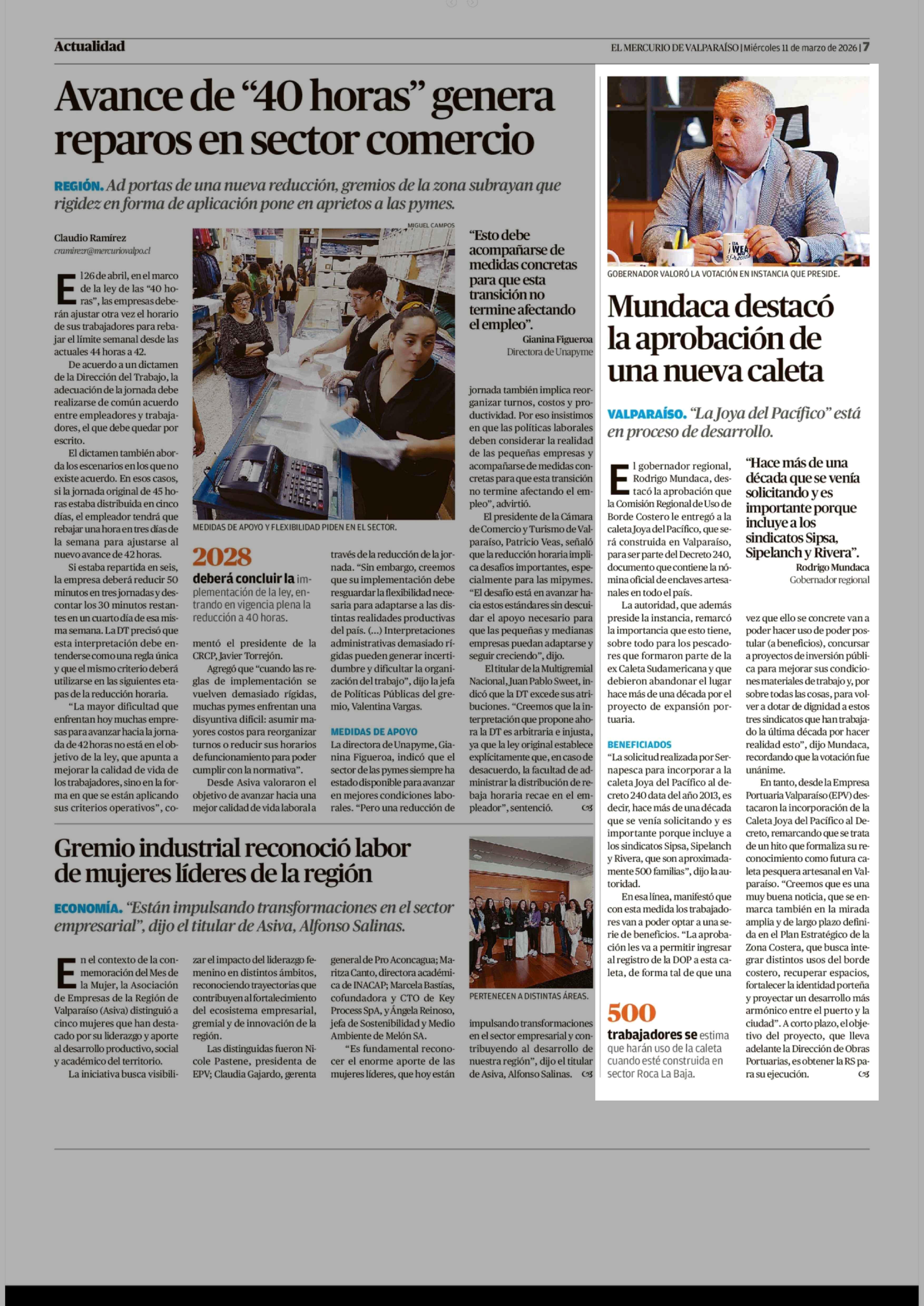 Mundaca destacó la aprobación de una nueva caleta 11-03-2026 El Mercurio de Valparaíso |