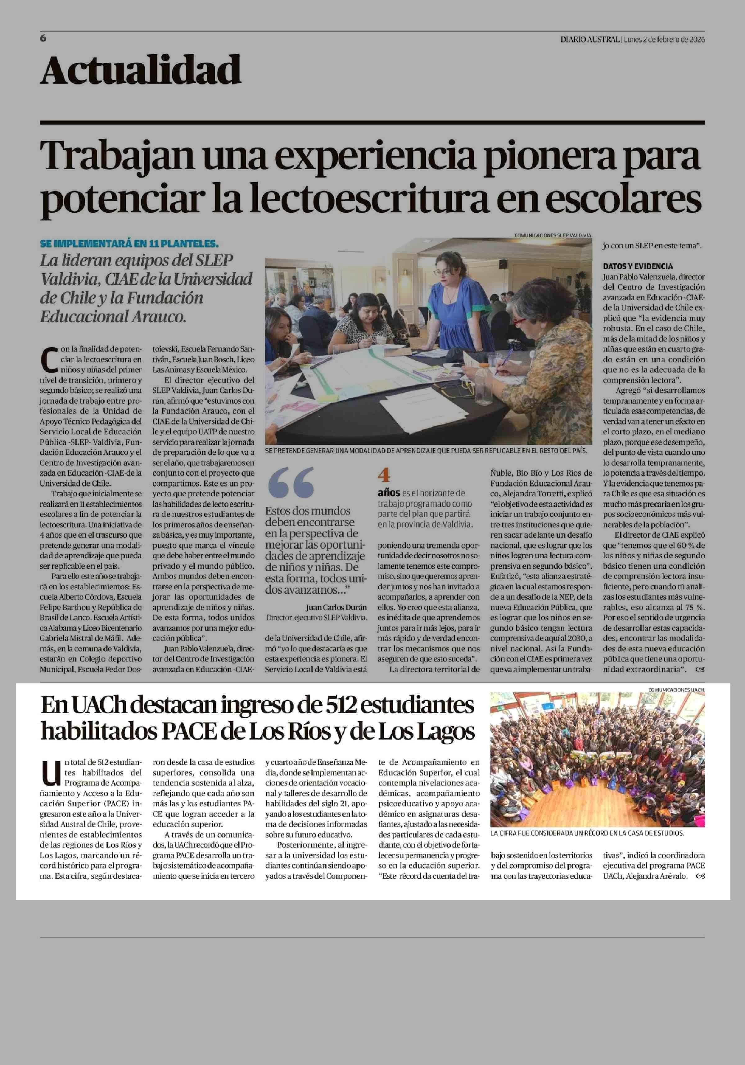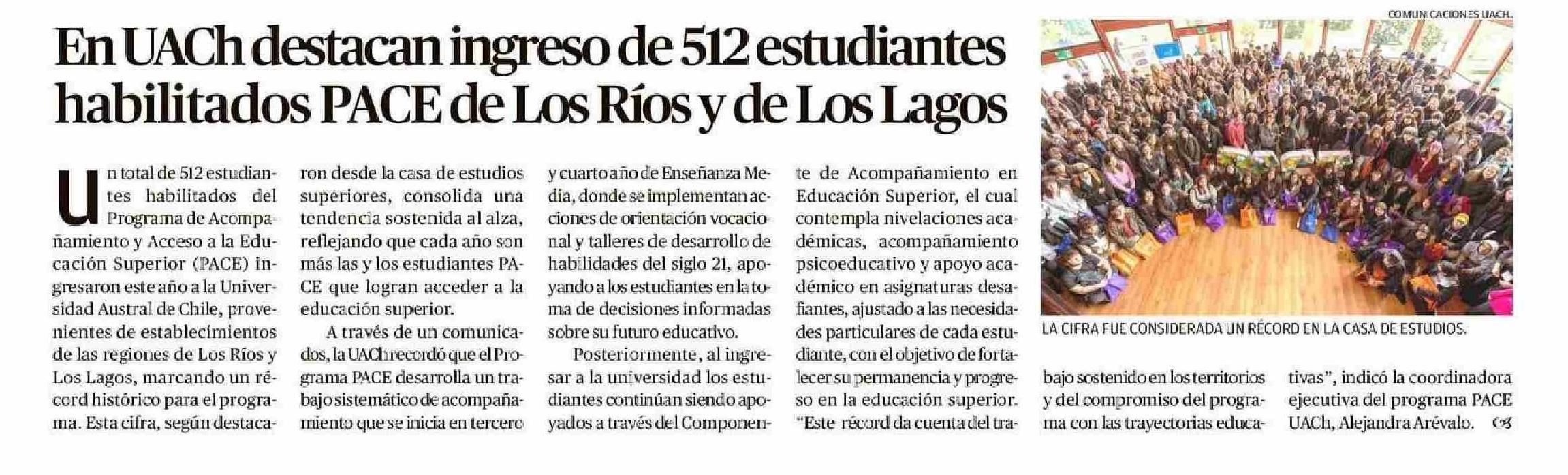 En UACH destacan ingreso de 512 estudiantes habilitados PACE de Los Ríos y de Los Lagos 02-02-2026 Diario Austral Región de Los Ríos |