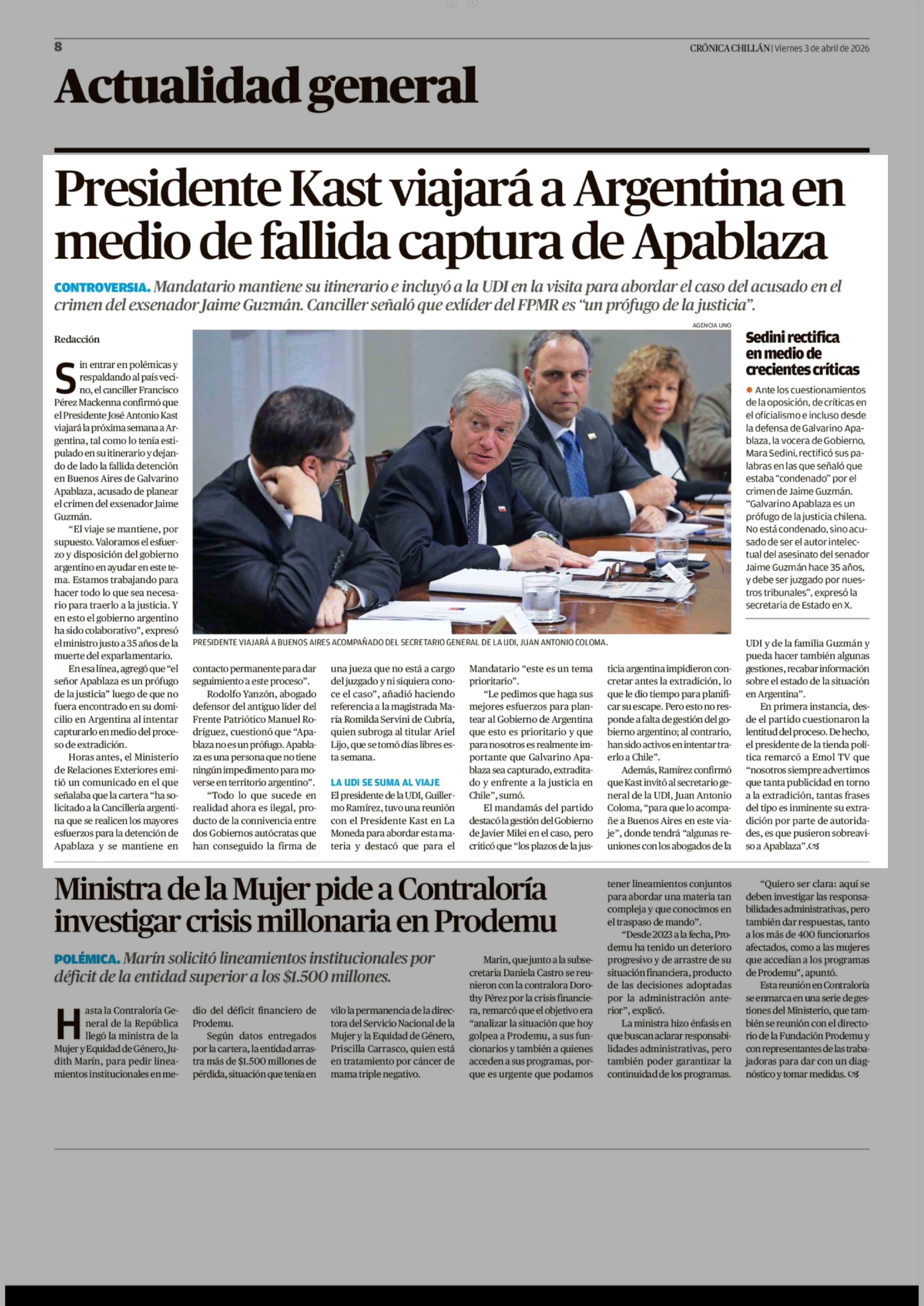 Presidente Kast viajará a Argentina en medio de fallida captura de Apablaza 03-04-2026 Crónica de Chillán |
