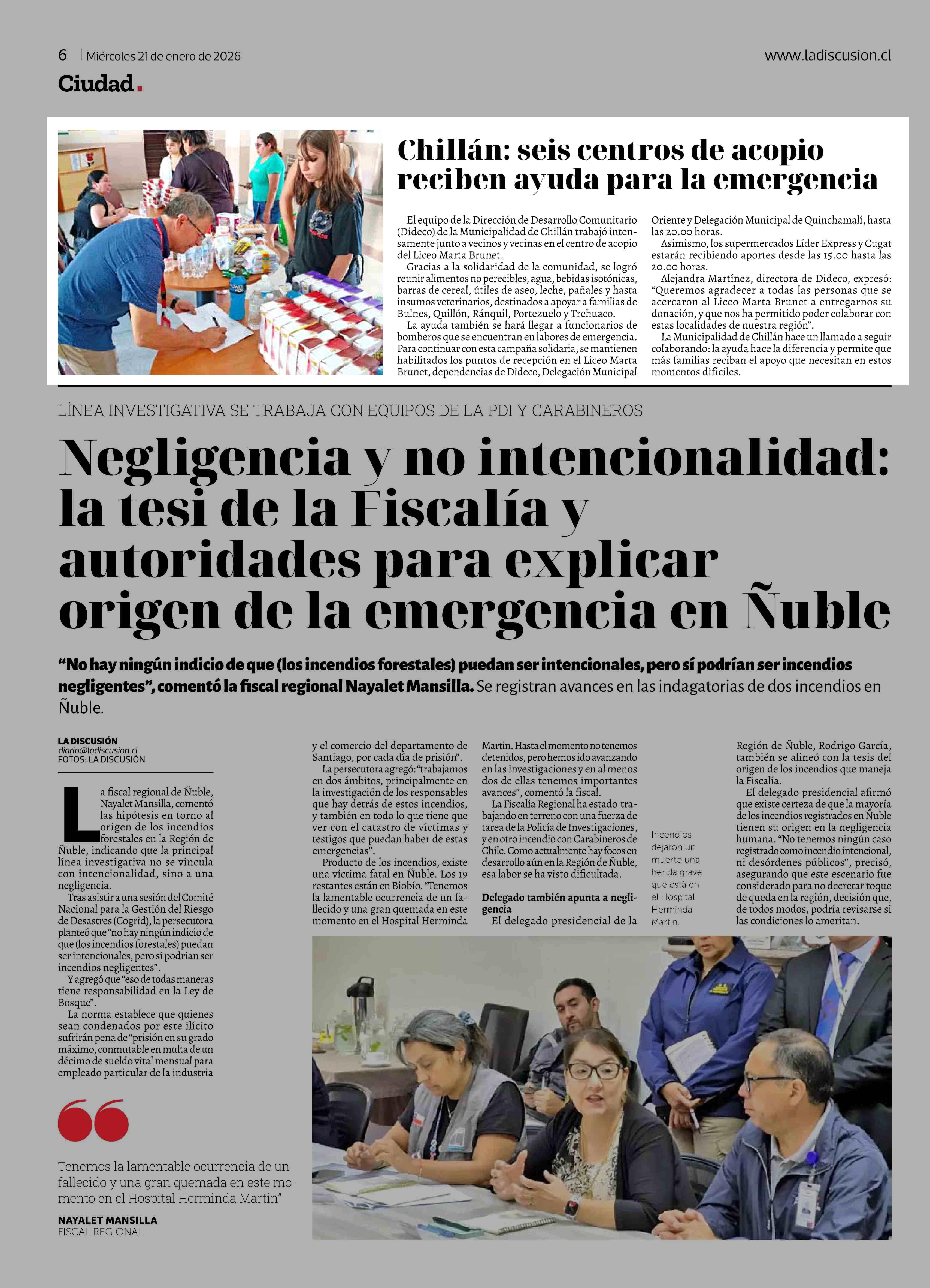 Chillán: seis centros de acopio reciben ayuda para la emergencia 21-01-2026 La Discusión |