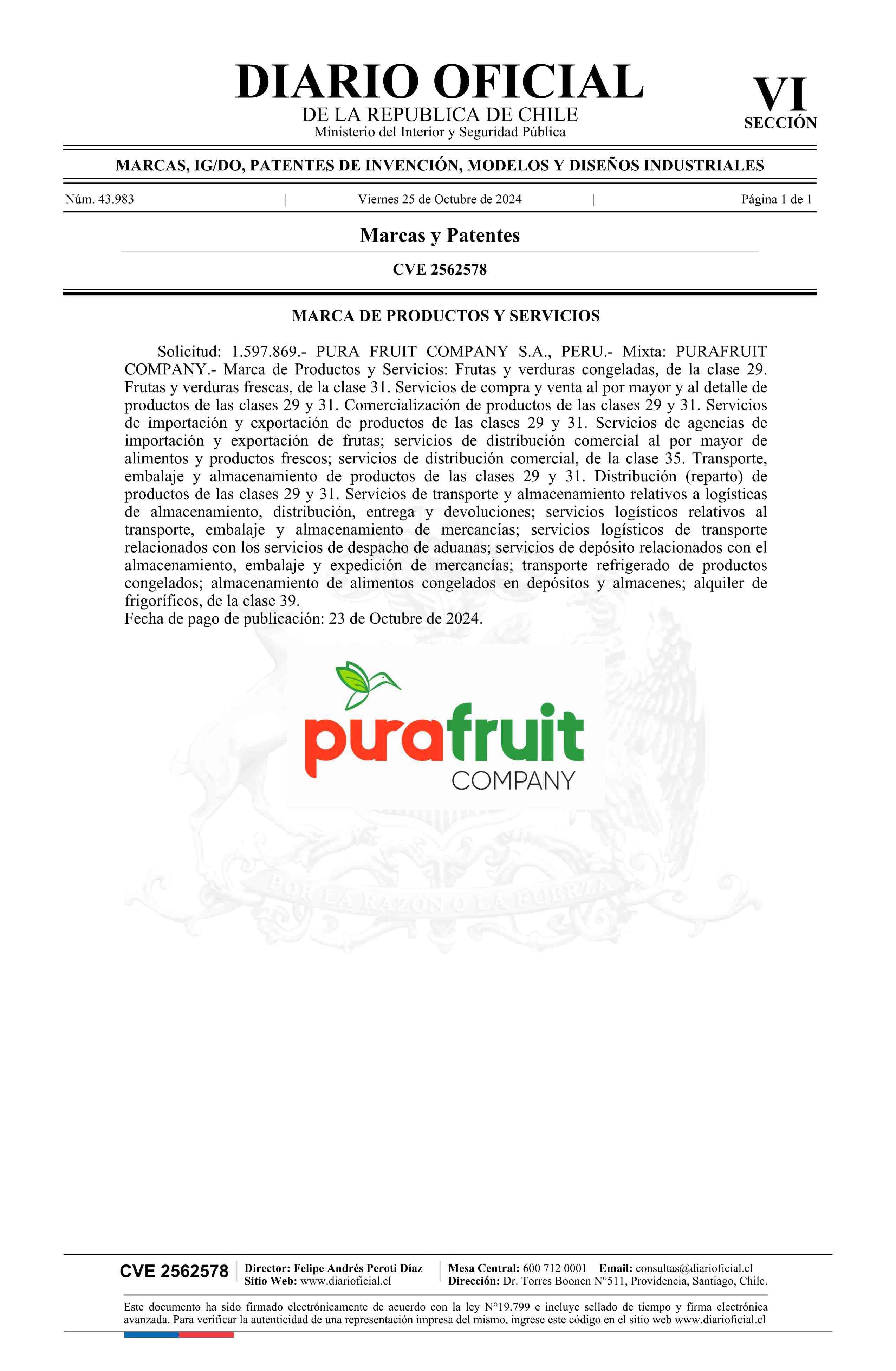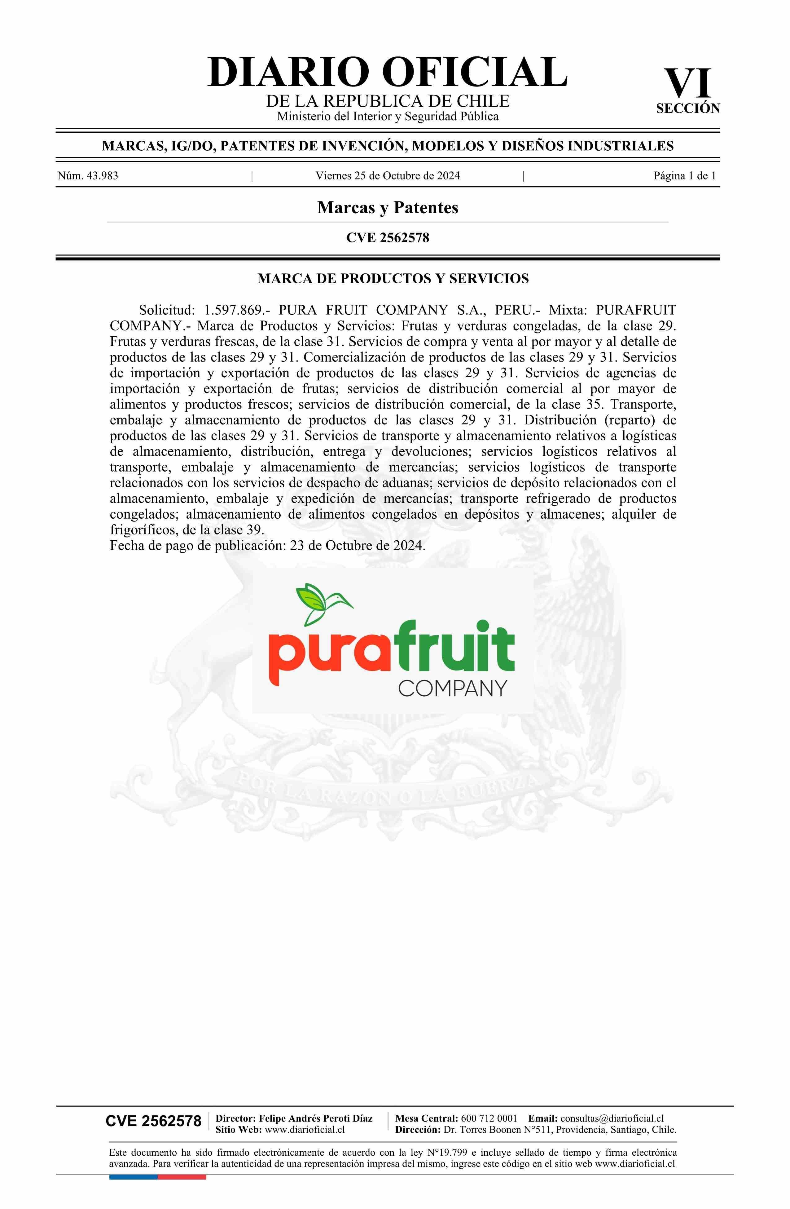 Solicitud número 1597869.- PURAFRUIT COMPANY 25-10-2024 Diario Oficial Edición Electrónica |