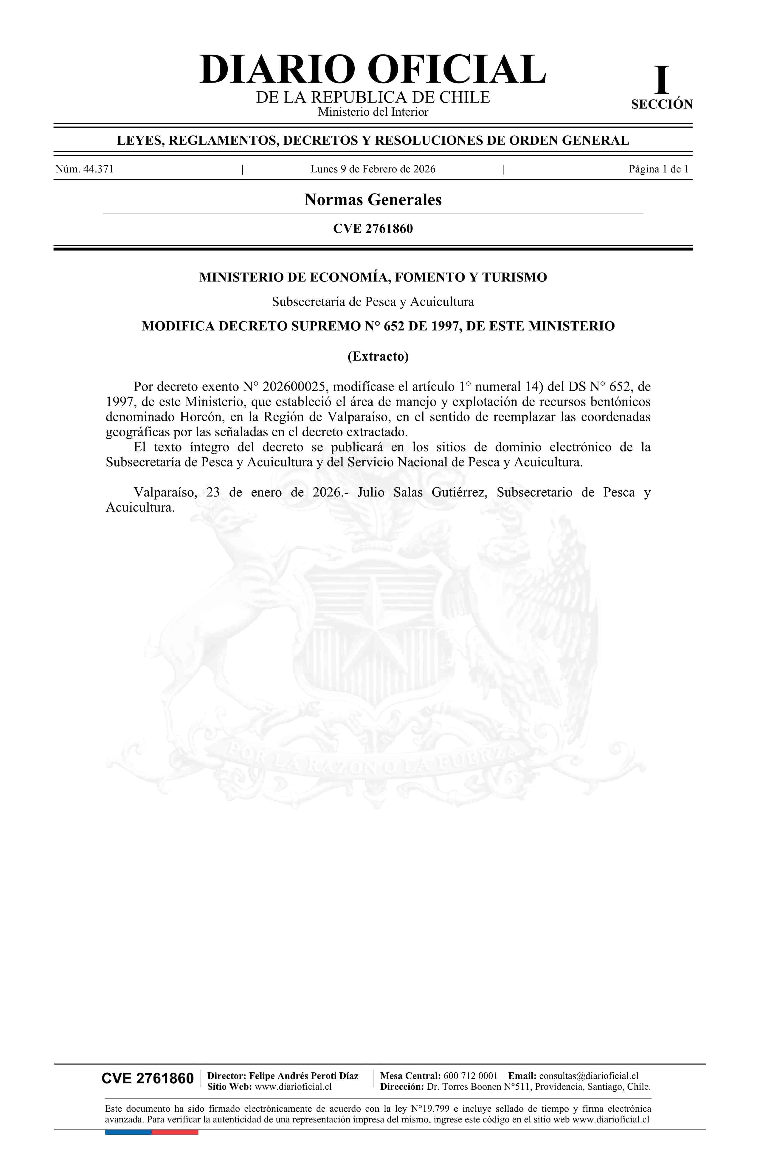 | Título: | Extracto de decreto exento número 202600025, de 2026.- Modifica decreto N° 652, de 1997 |