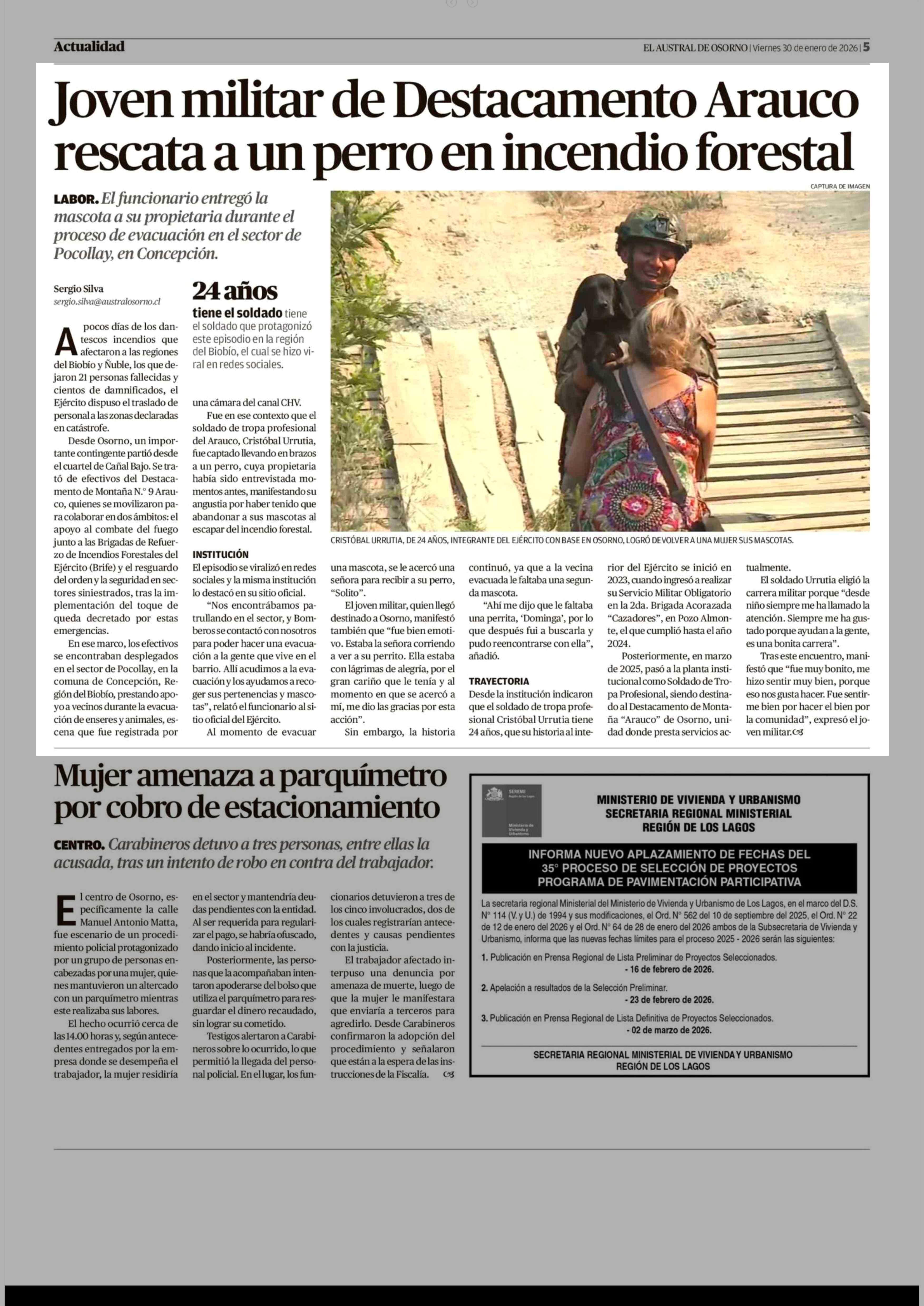 Joven militar de Destacamento Arauco rescata a un perro en incendio forestal 30-01-2026 El Austral de Osorno |