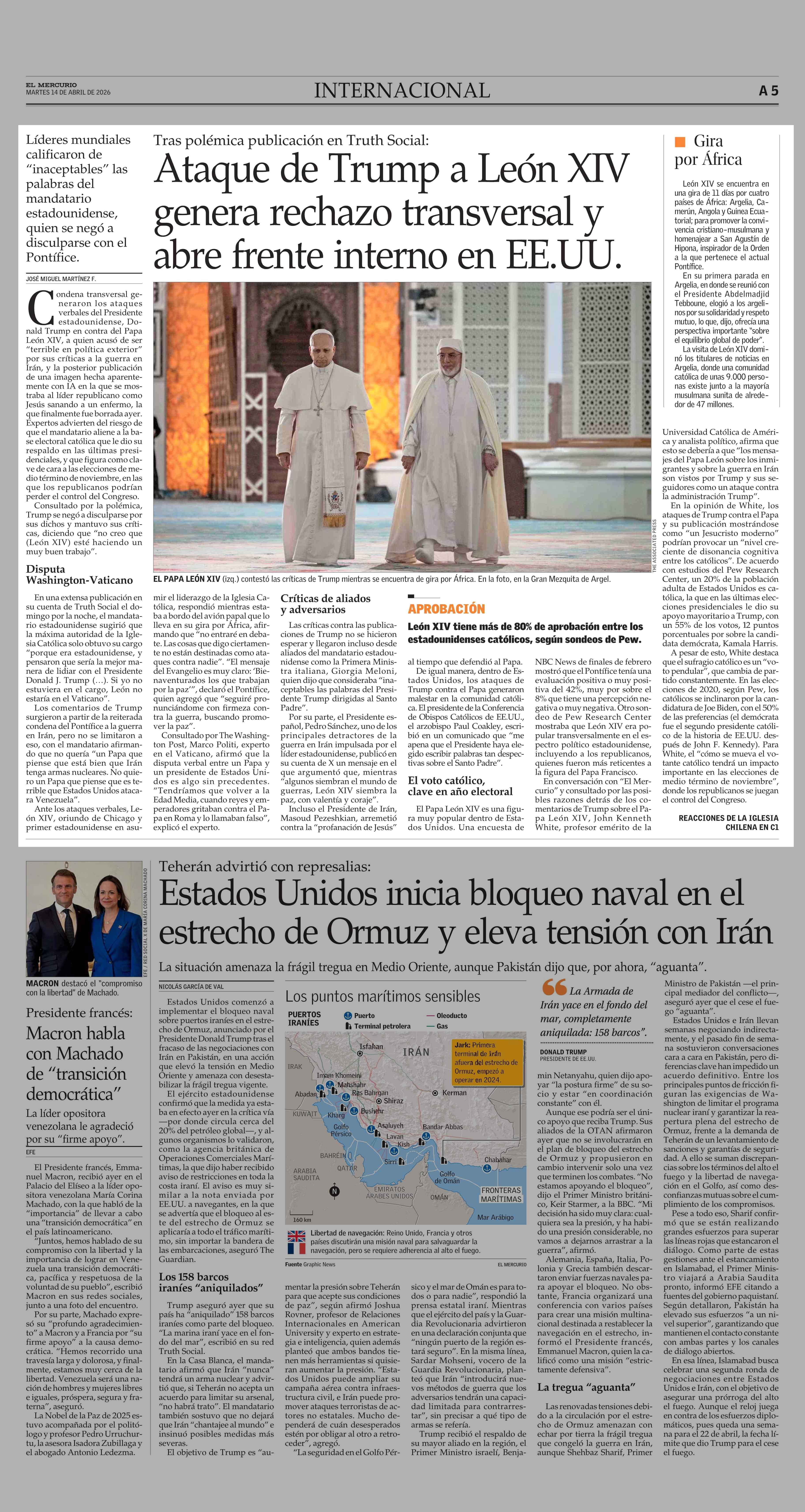 Ataque de Trump a León XIV genera rechazo transversal y abre frente interno en EE.UU. 14-04-2026 El Mercurio |