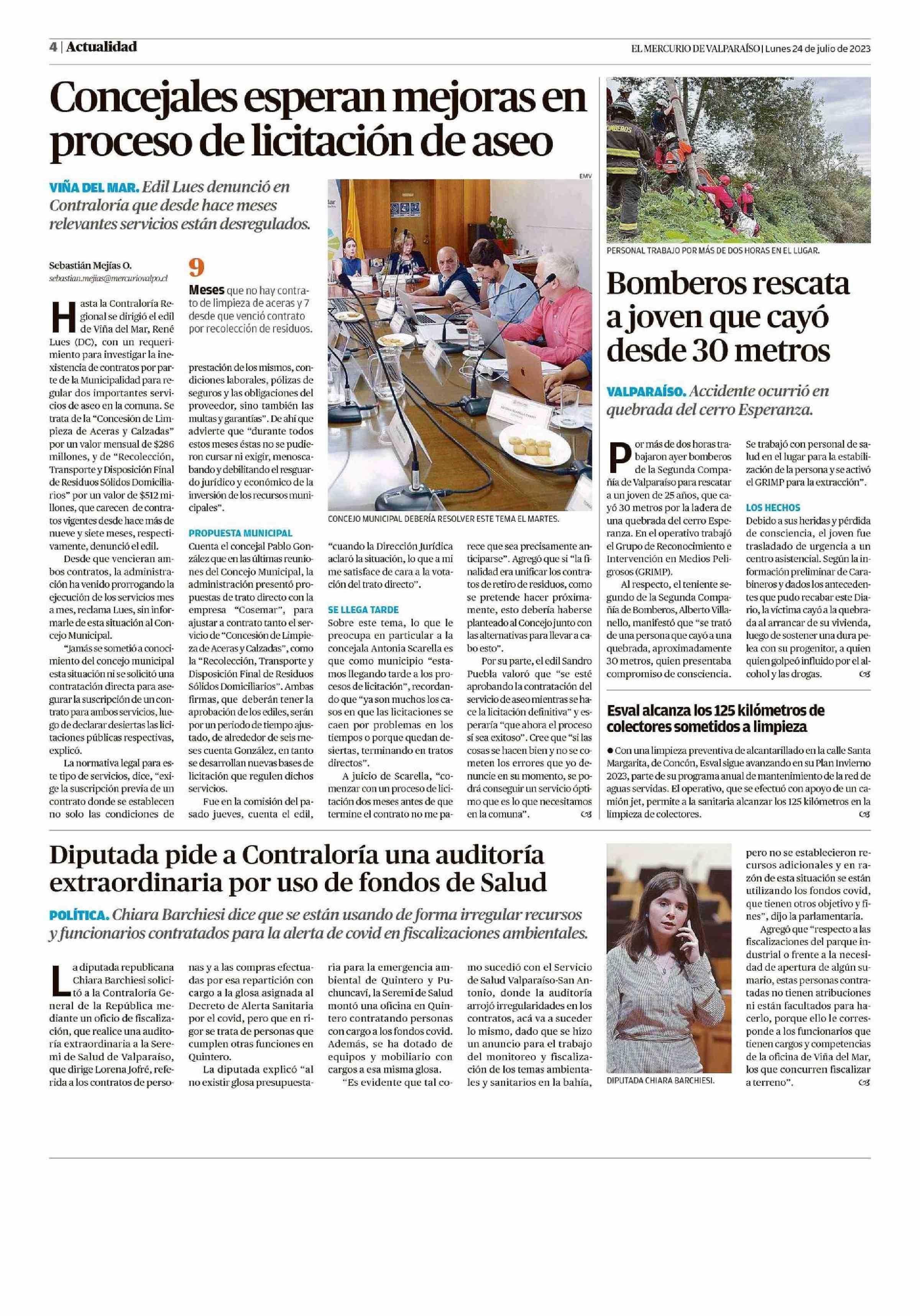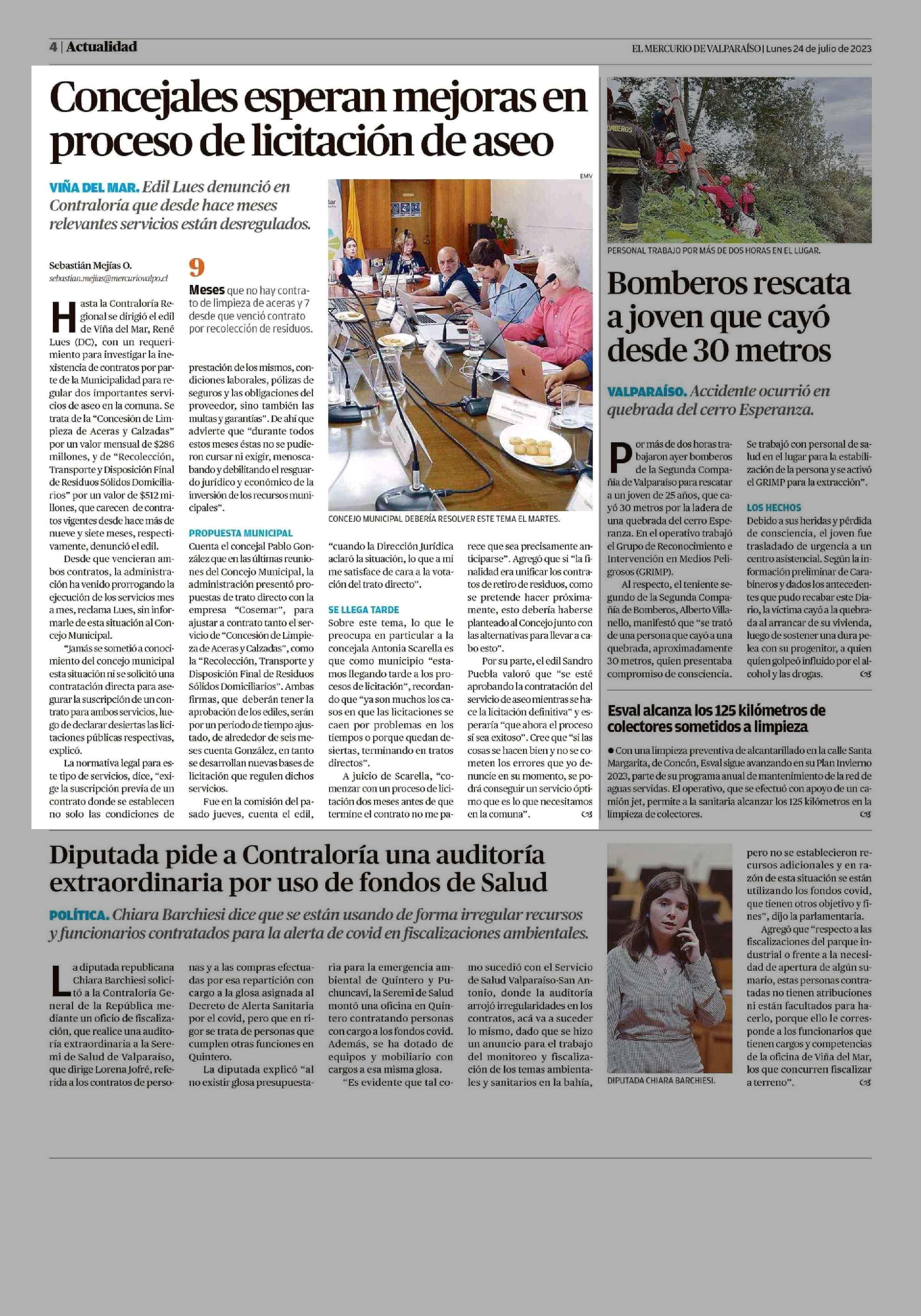 Concejales esperan mejoras en proceso de licitación de aseo 24-07-2023 El Mercurio de Valparaíso |