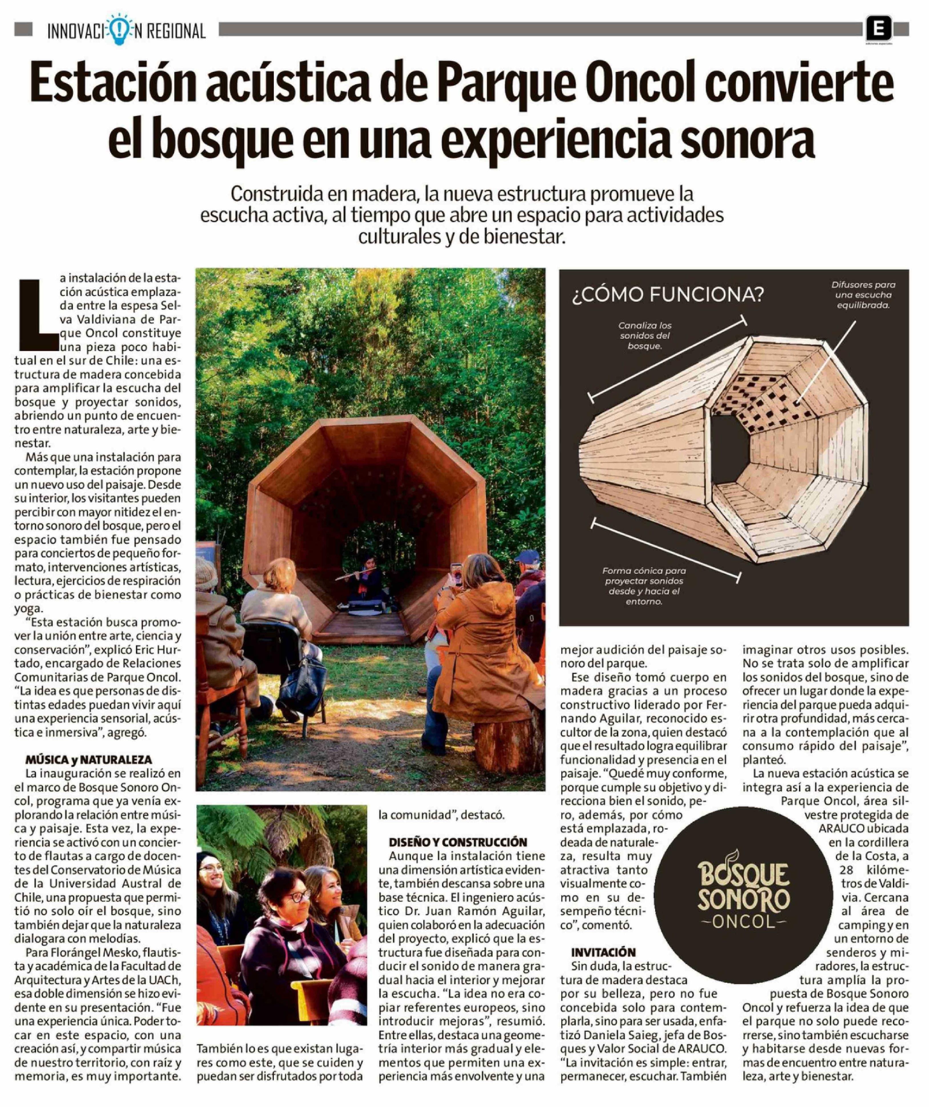 Estación acústica de Parque Oncol convierte el bosque en una experiencia sonora 26-04-2026 Diario Austral Región de Los Ríos |