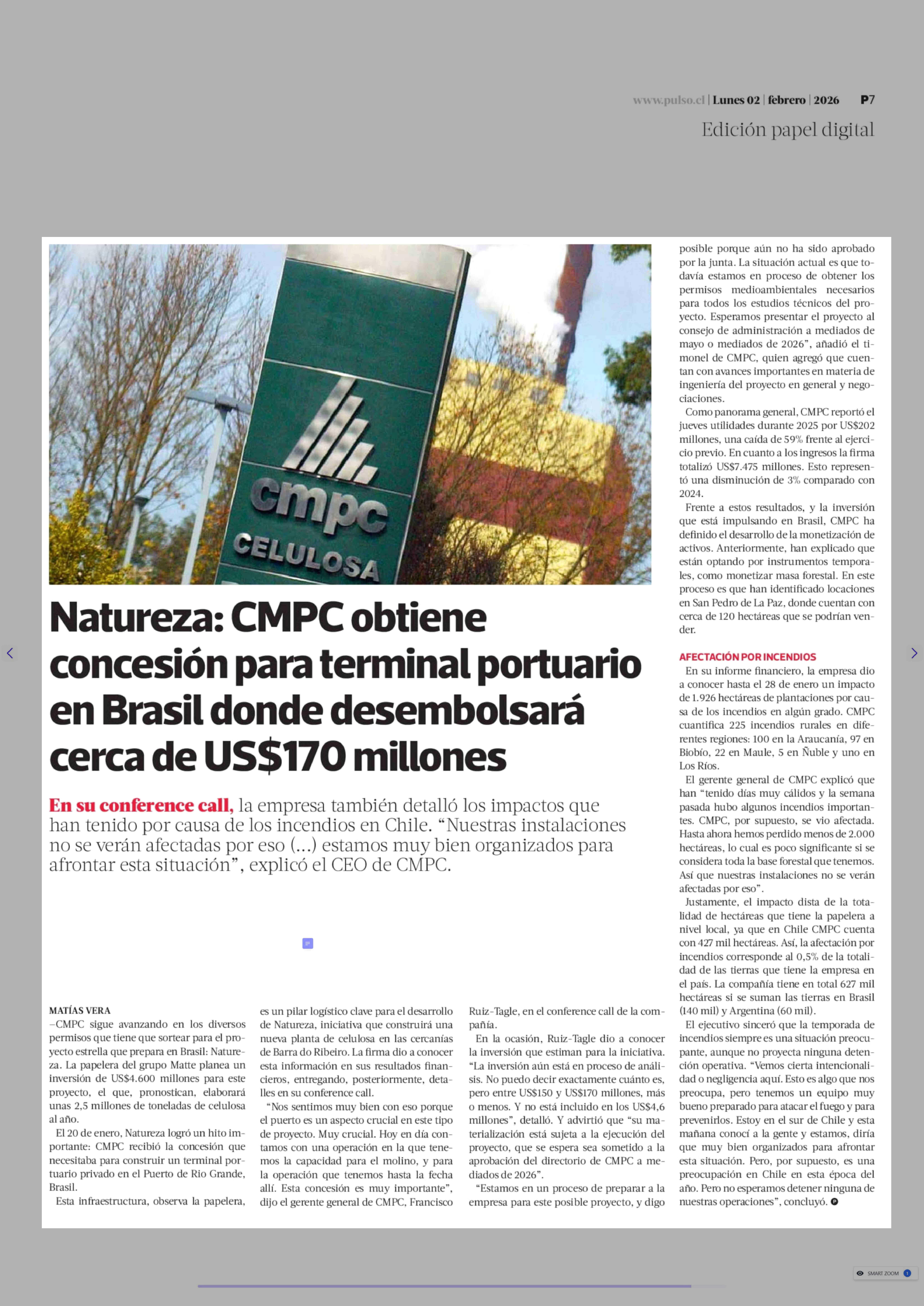 Título: Natureza: CMPC obtiene concesión para terminal portuario en Brasil donde desembolsará cerca de US$170 millones