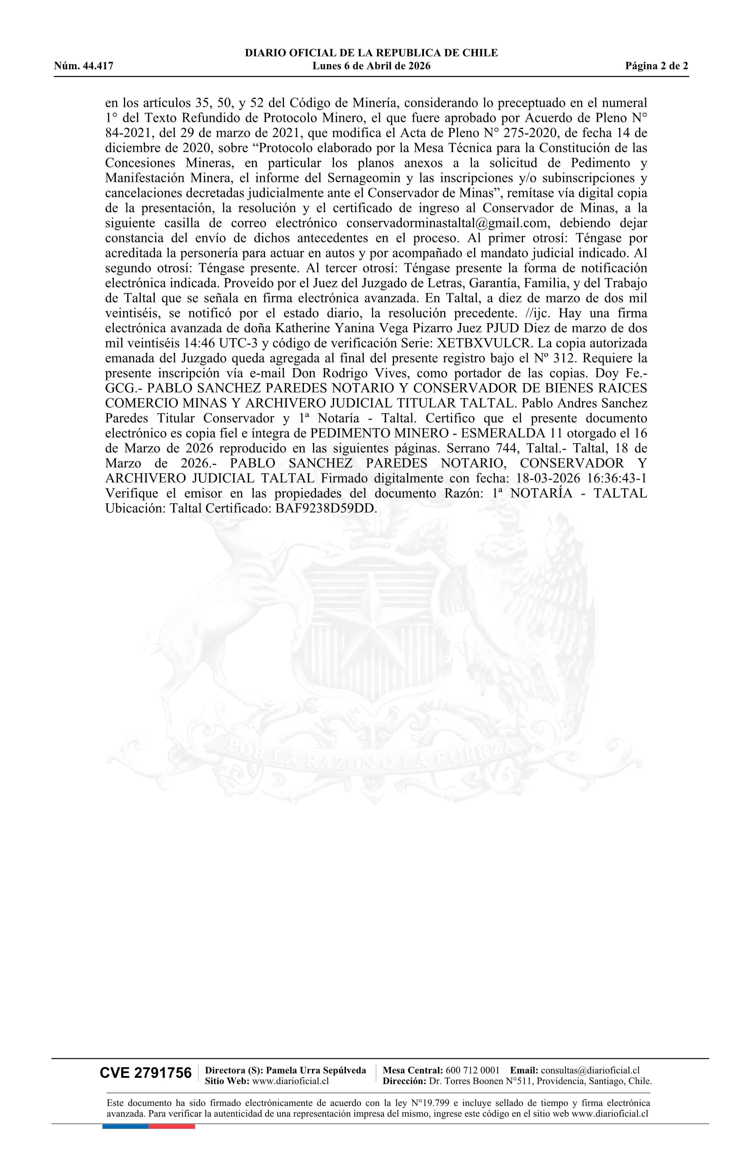 ESMERALDA 11 / Gold Fields Pedernales Limitada 06-04-2026 DIARIO OFICIAL CHILE - BOLETÍN OFICIAL DE MINERÍA |