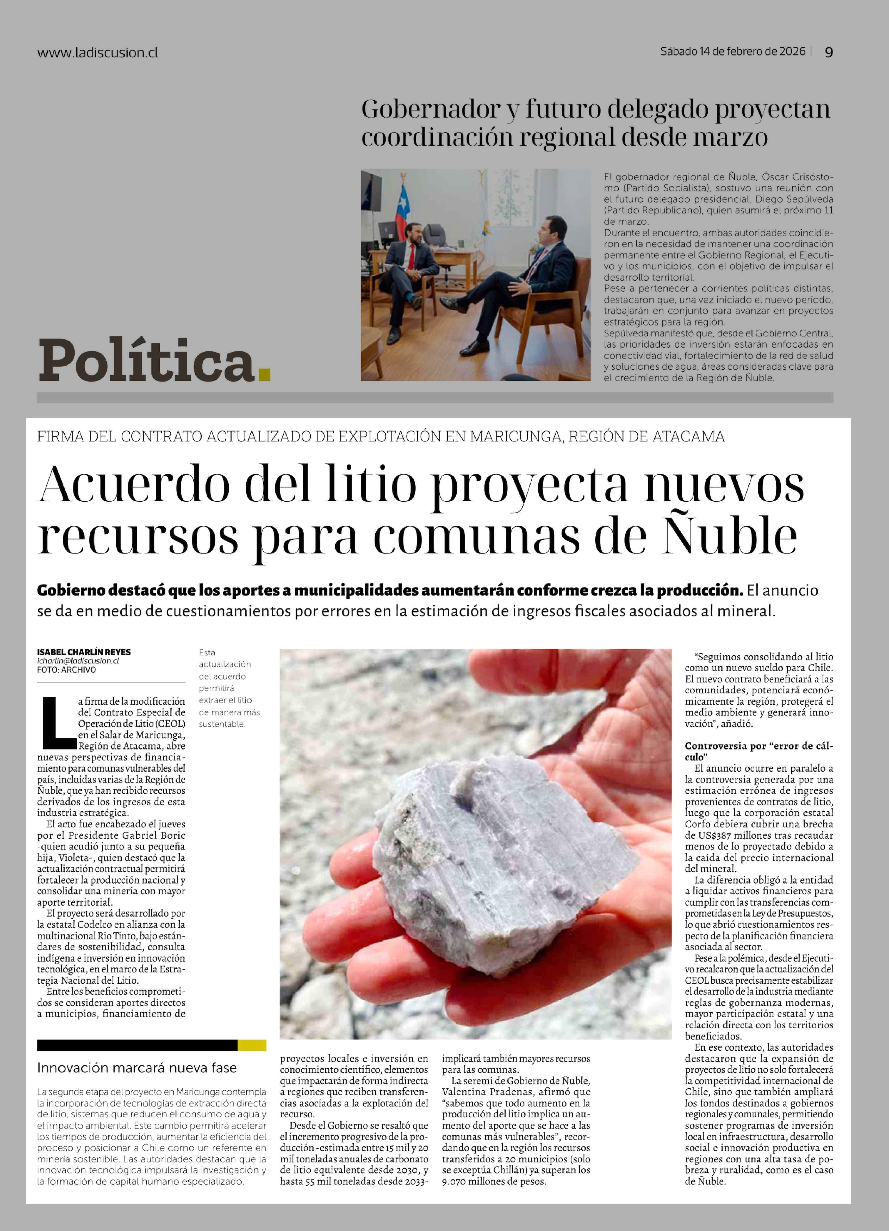Título: Acuerdo del litio proyecta nuevos recursos para comunas de Nuble