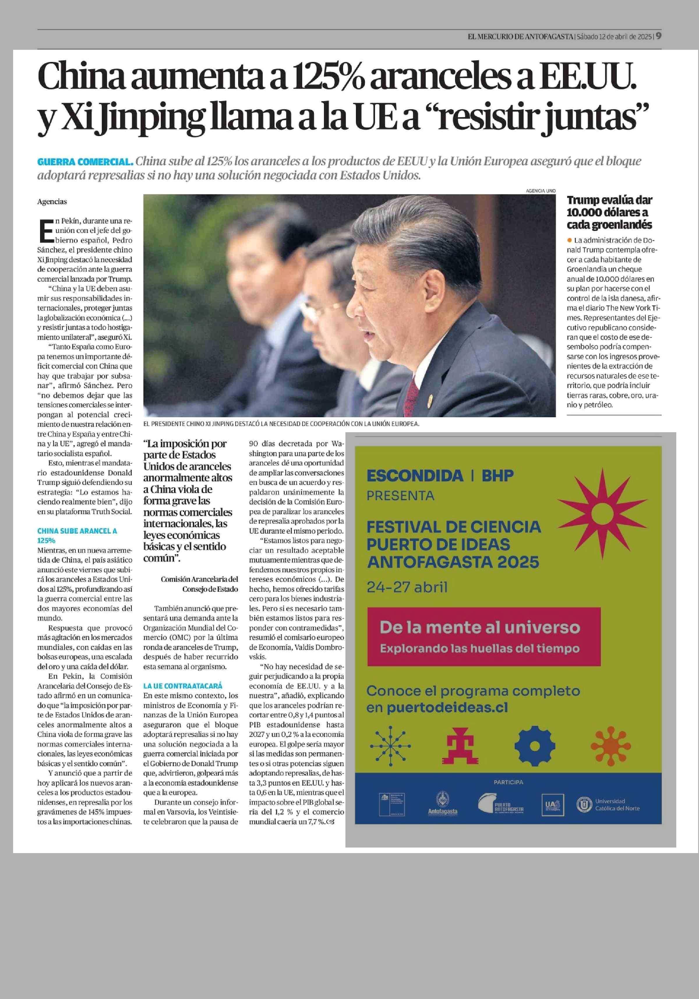 China aumenta a 125% aranceles a ER. UU. y Xi Jinping llama a la UE a “resistir juntas” 12-04-2025 El Mercurio de Antofagasta |