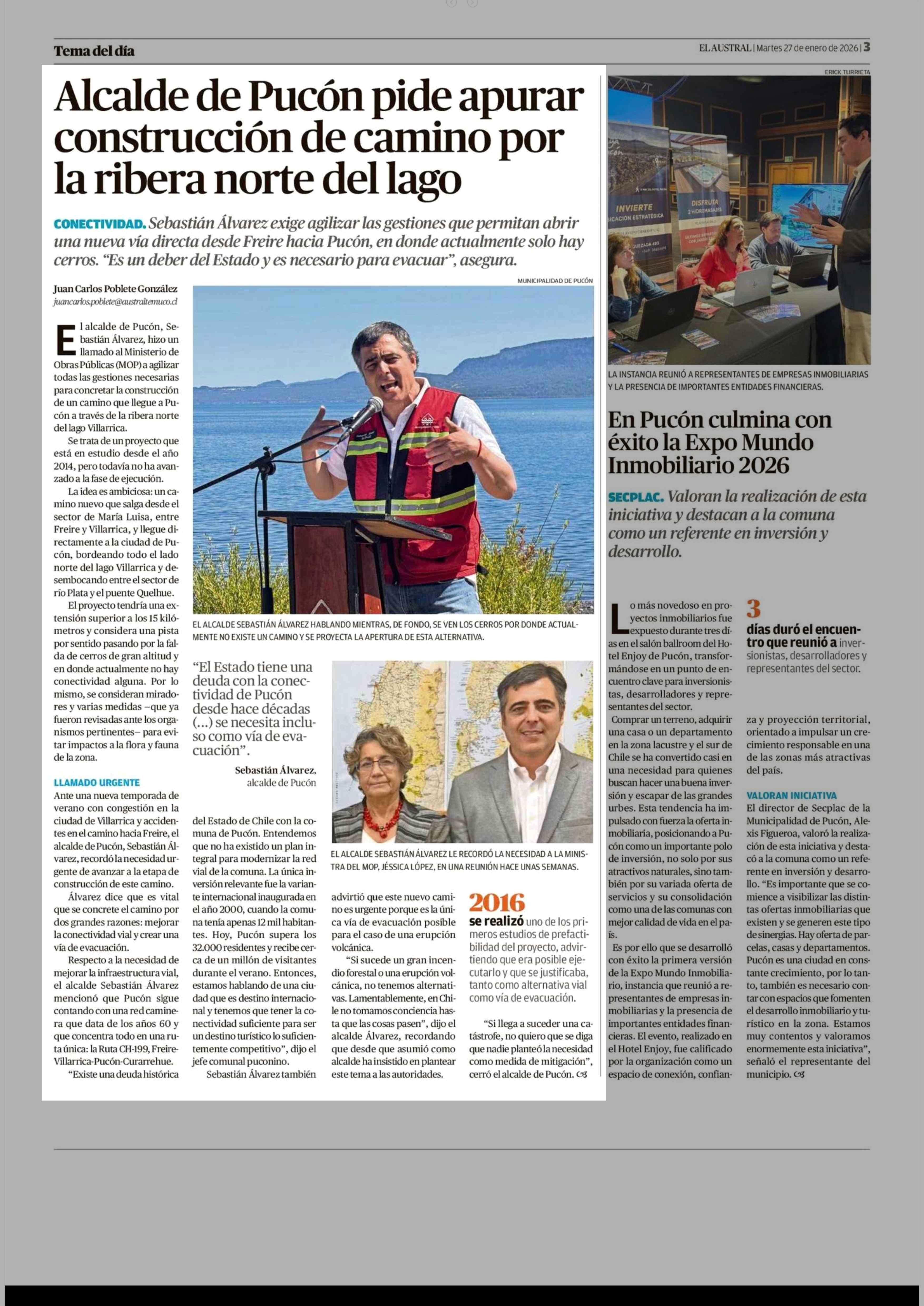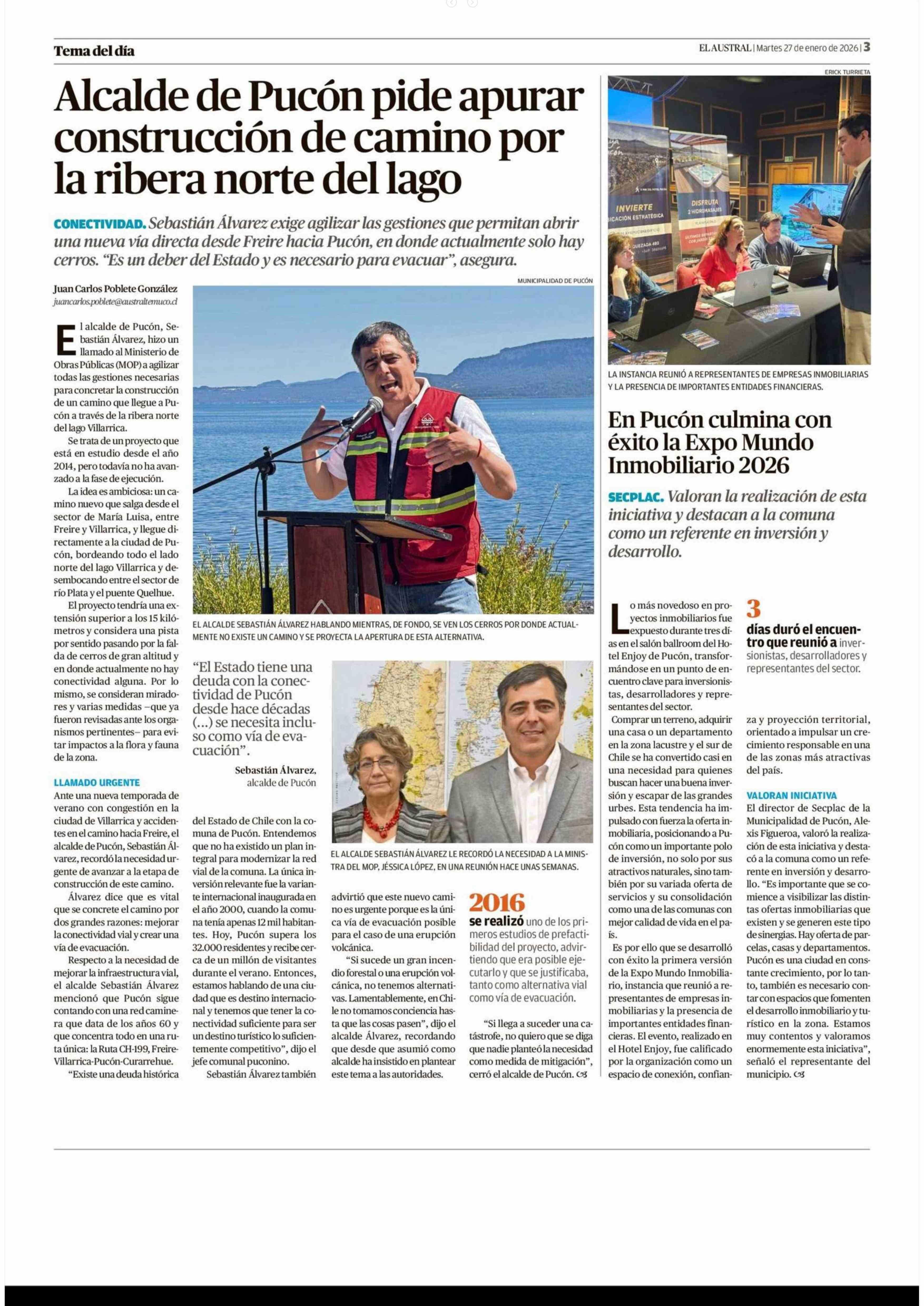 Alcalde de Pucón pide apurar construcción de camino por la ribera norte del lago 27-01-2026 El Austral de la Araucanía |