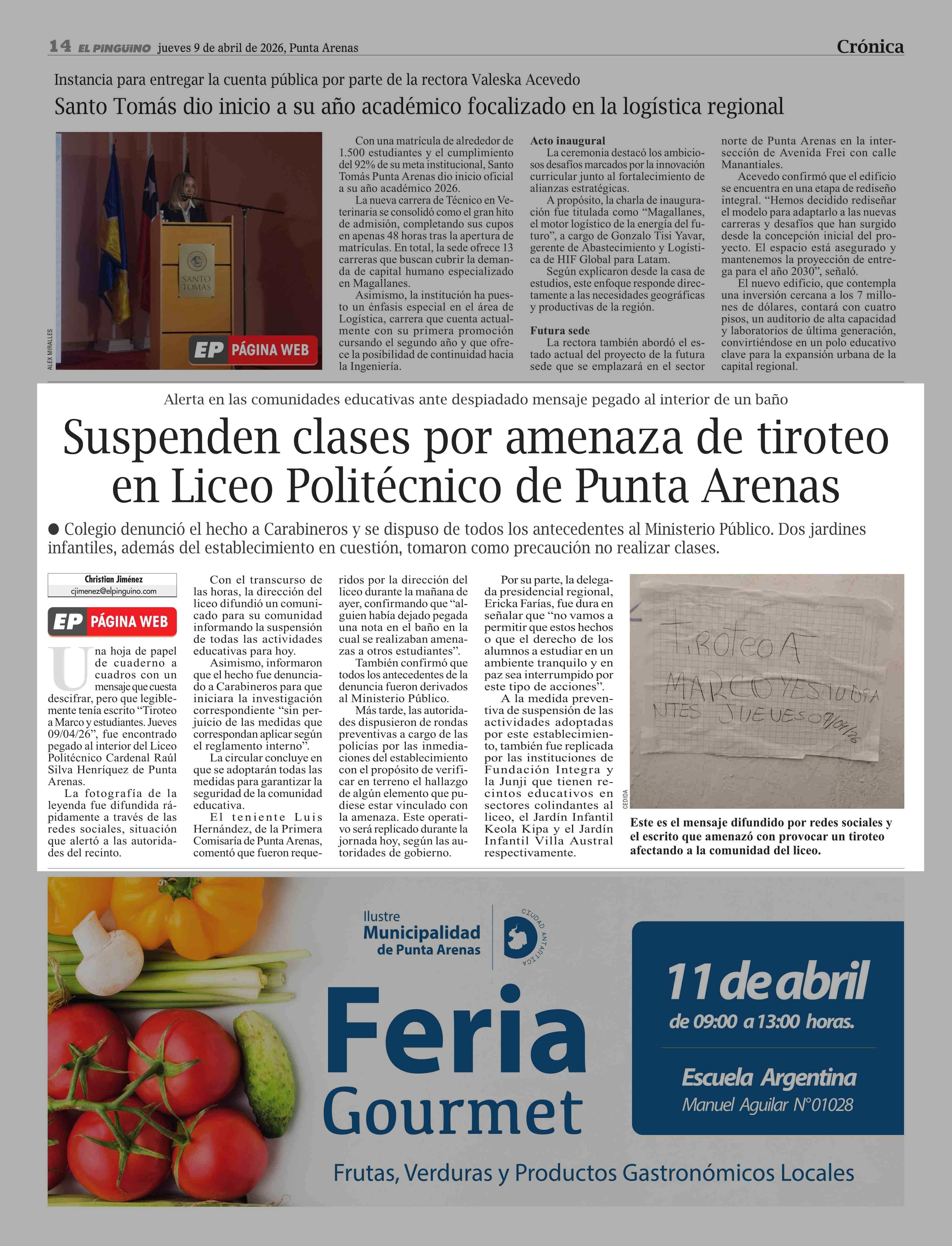 Suspenden clases por amenaza de tiroteo en Liceo Politécnico de Punta Arenas 09-04-2026 El Pingüino |