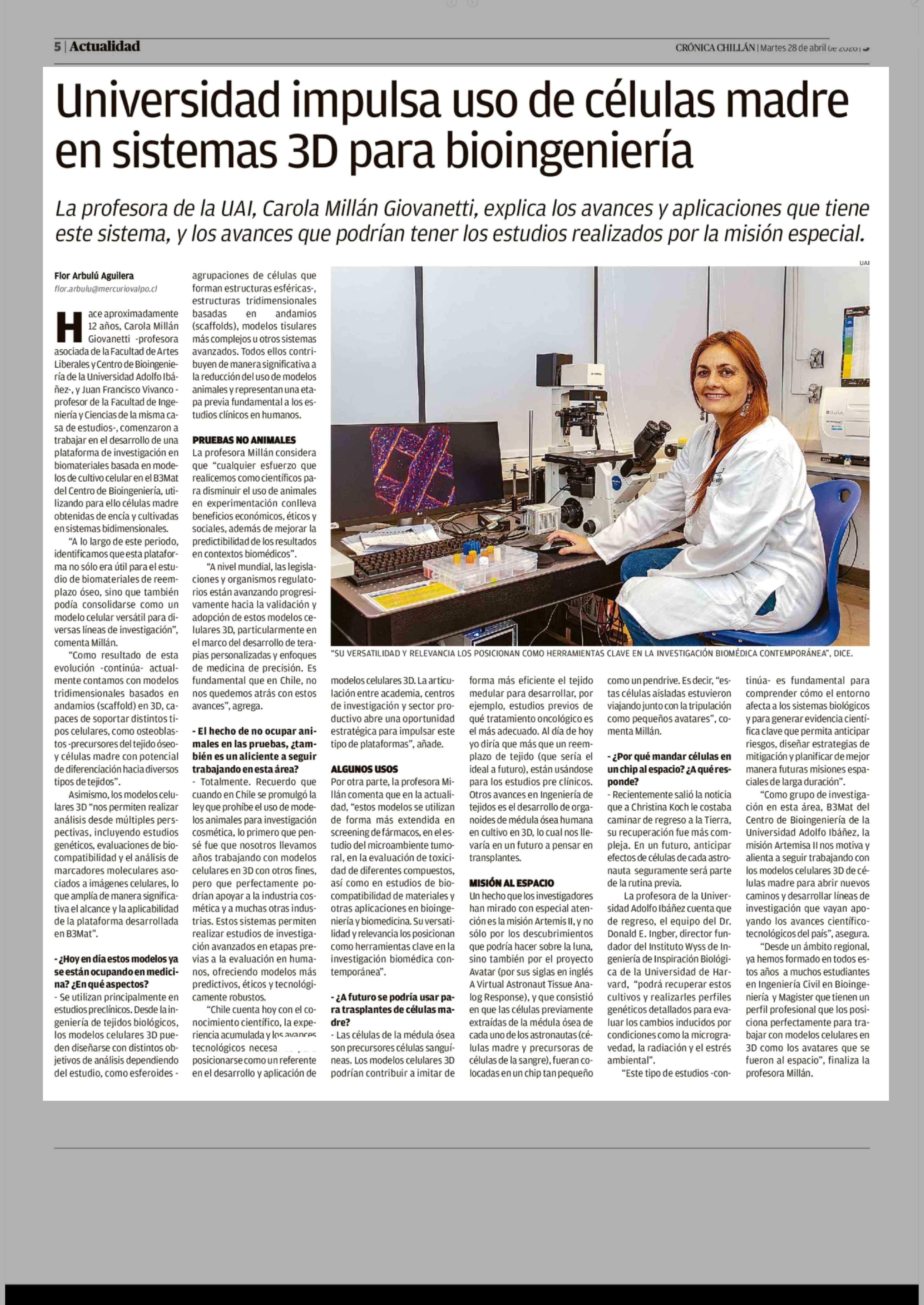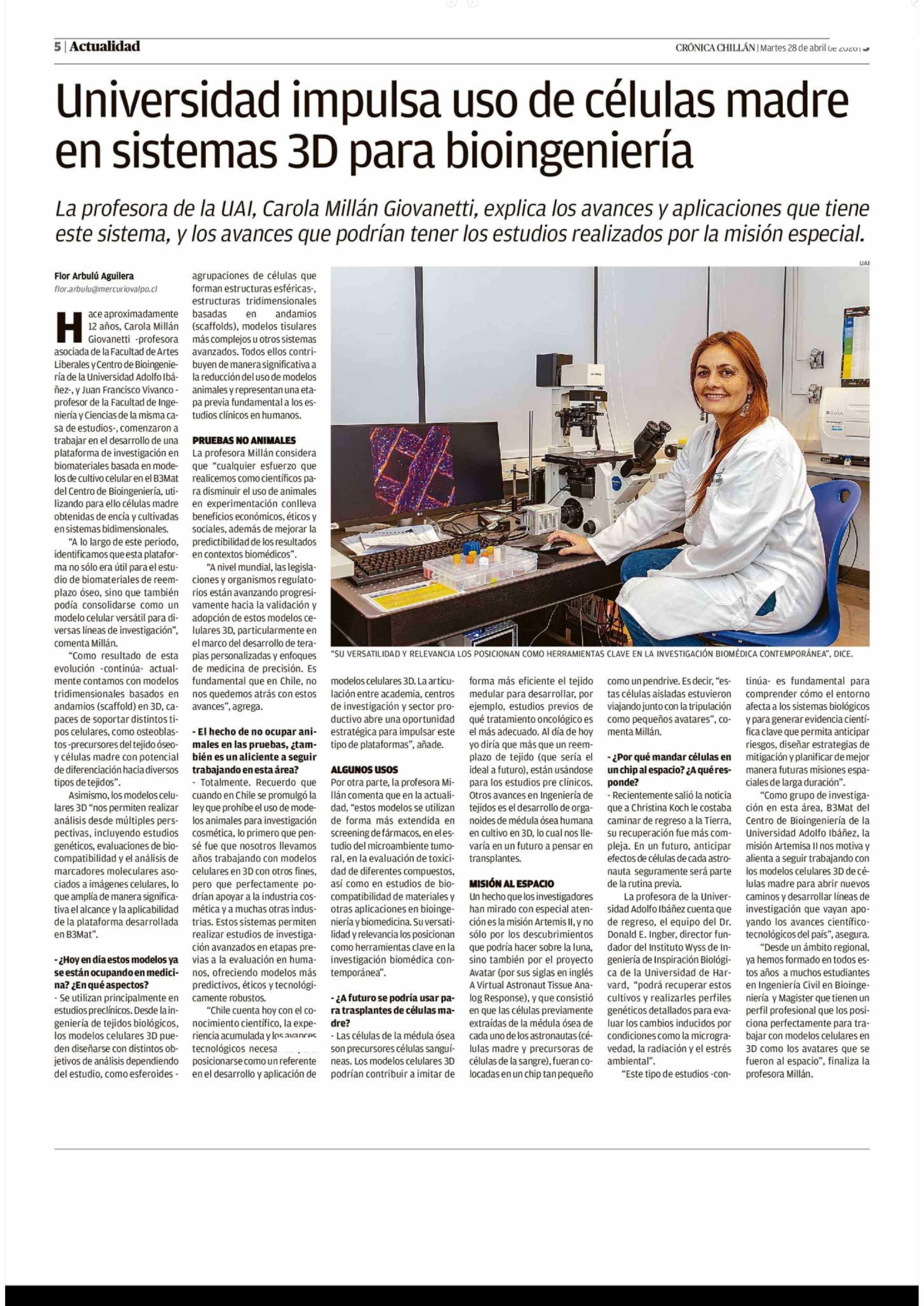 Universidad impulsa uso de células madre en sistemas 3D para bioingeniería 28-04-2026 Crónica de Chillán |