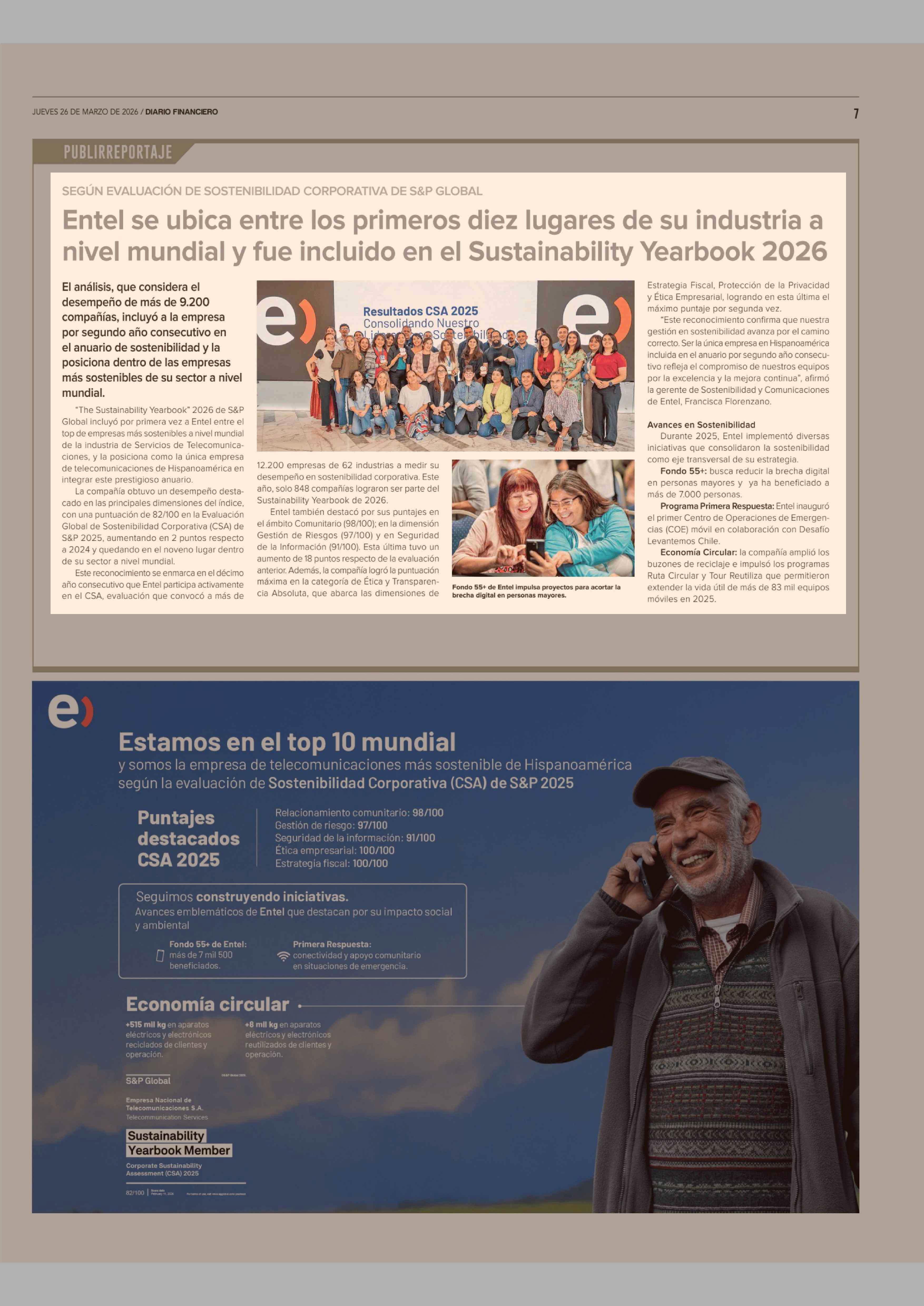 Título: Entel se ubica entre los primeros diez lugares de su industria a nivel mundial y fue incluido en el Sustainability Yearbook 2026