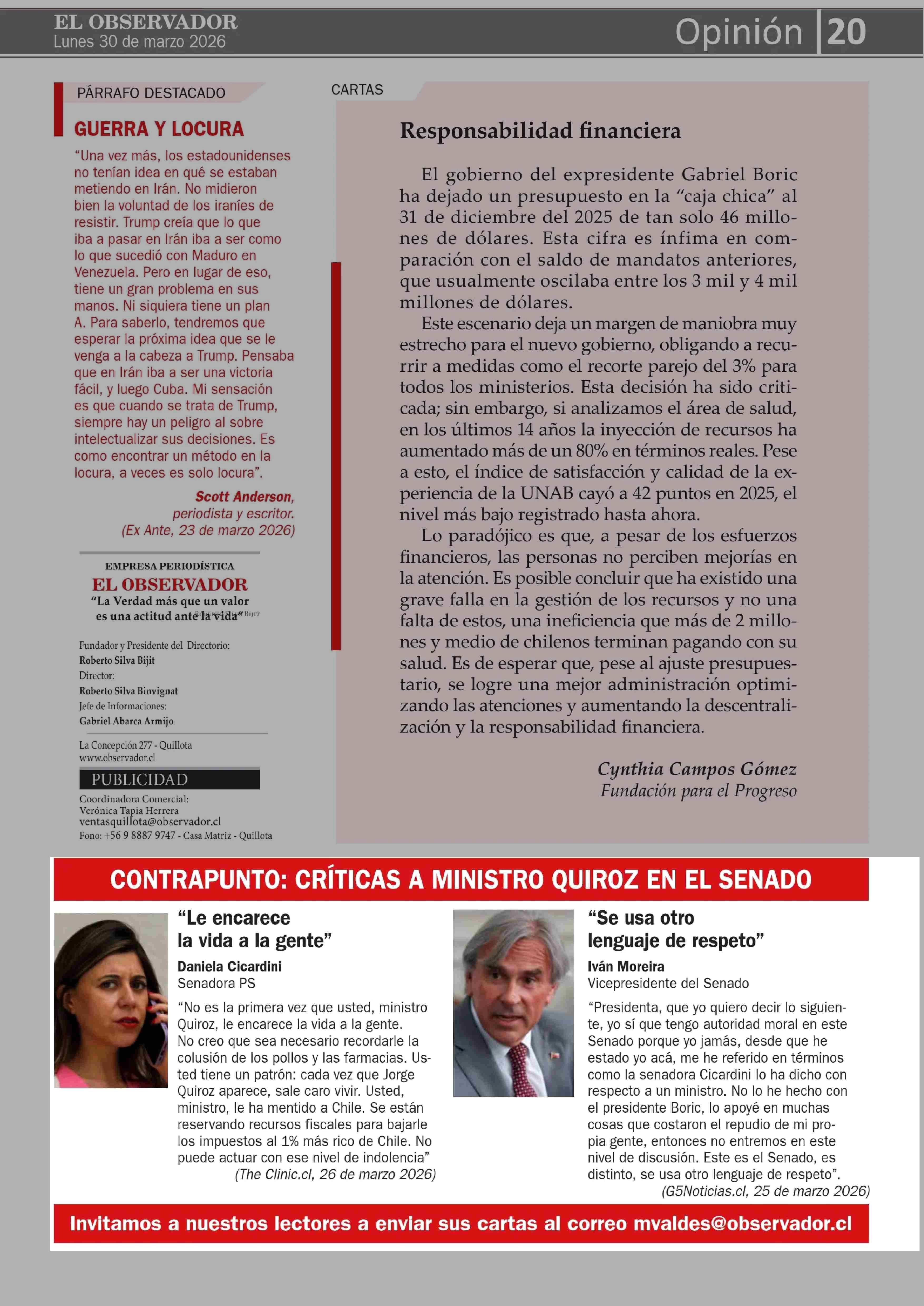 CONTRAPUNTO: CRÍTICAS A MINISTRO QUIROZ EN EL SENADO 30-03-2026 El Observador Vespertino |