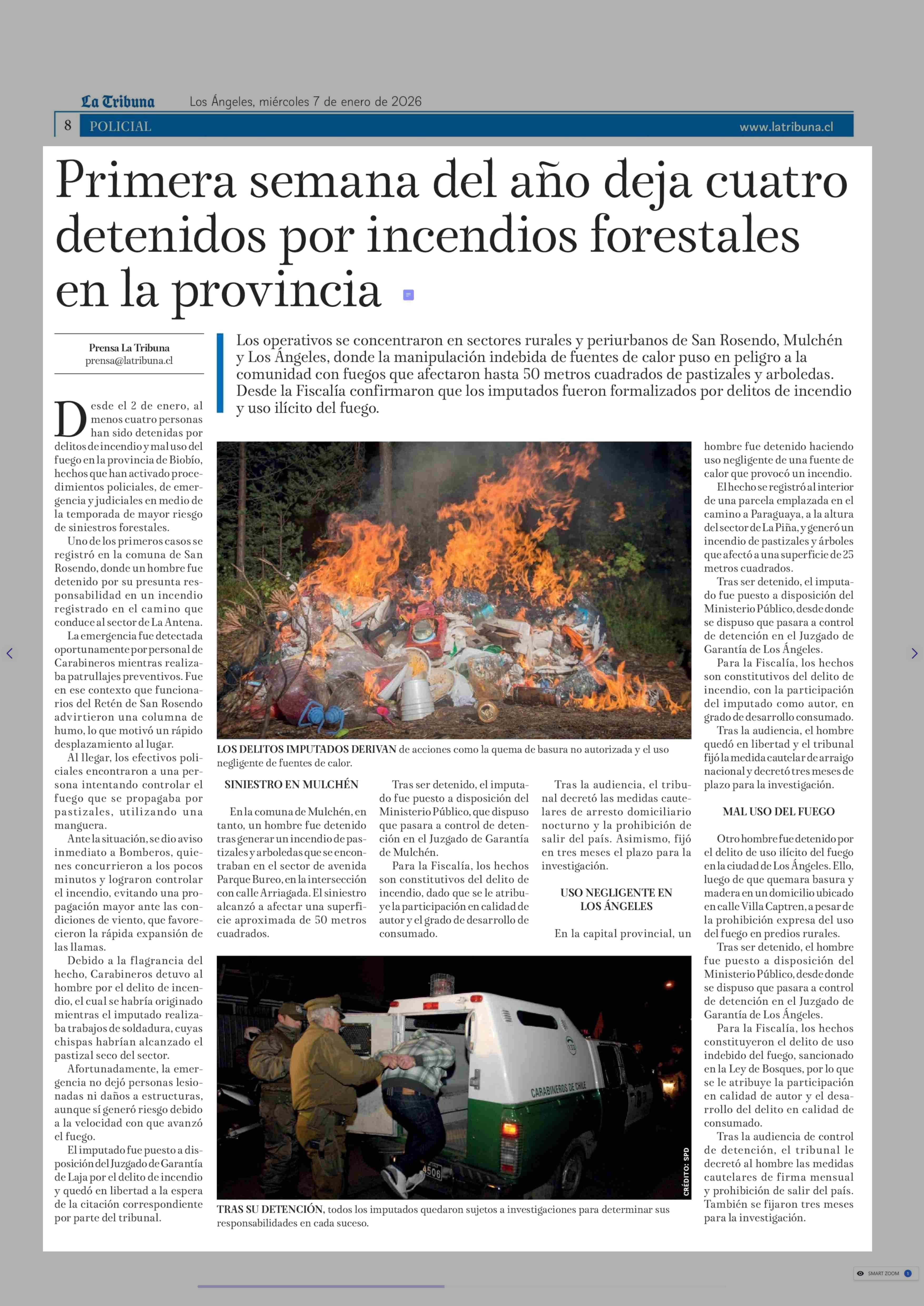 Primera semana del año deja cuatro detenidos por incendios forestales en la provincia 07-01-2026 La Tribuna |