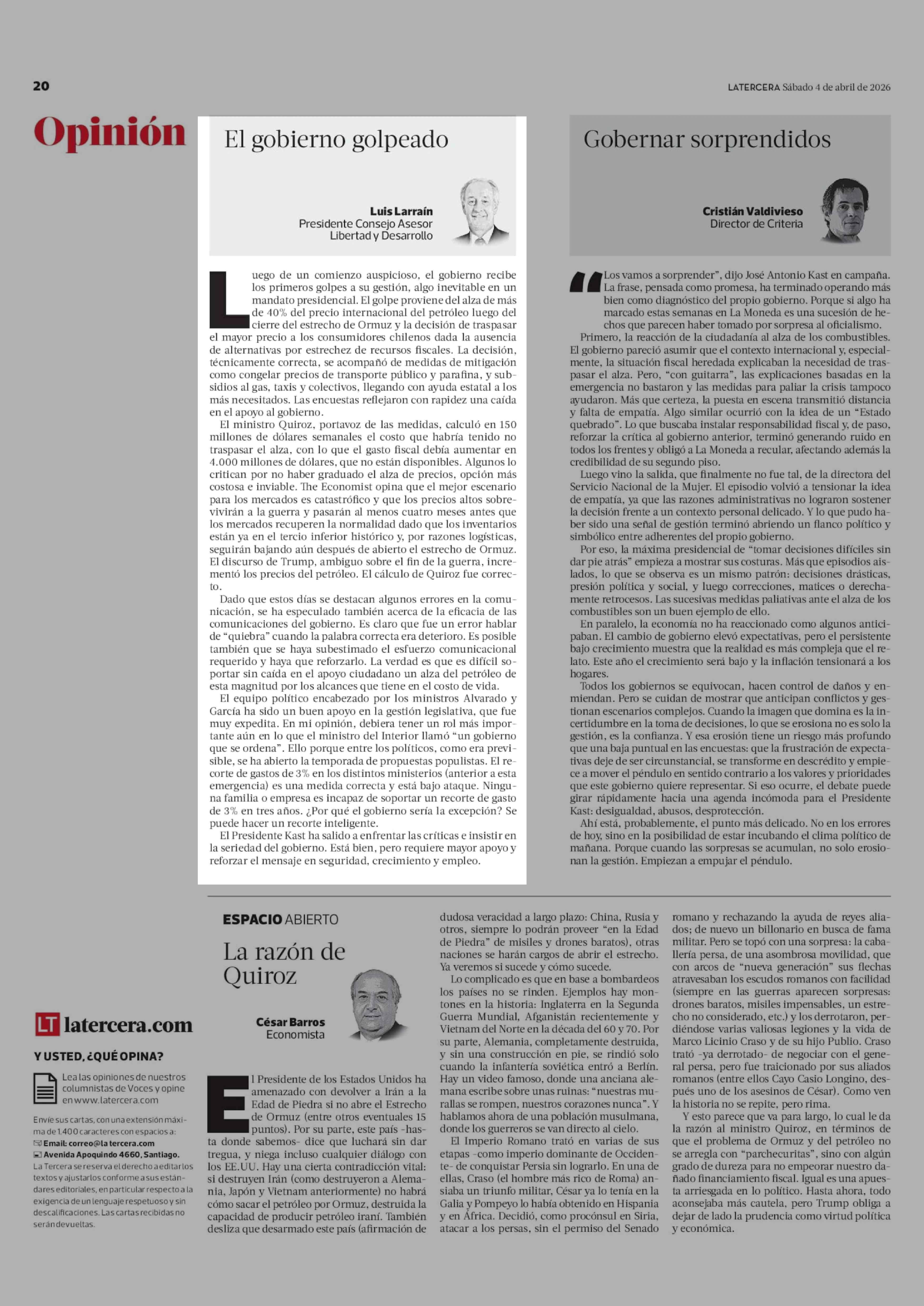 Columnas de Opinión: El gobierno golpeado 04-04-2026 La Tercera |