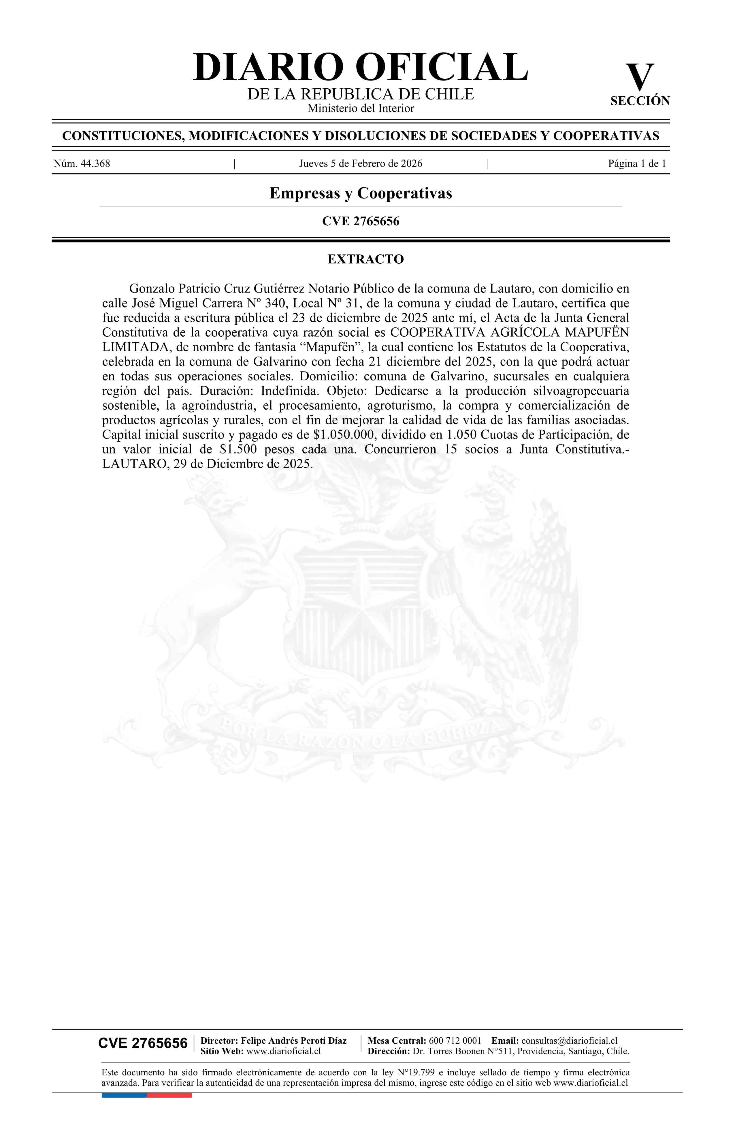 COOPERATIVA AGRÍCOLA MAPUFËN LIMITADA 05-02-2026 Diario Oficial Edición Electrónica |