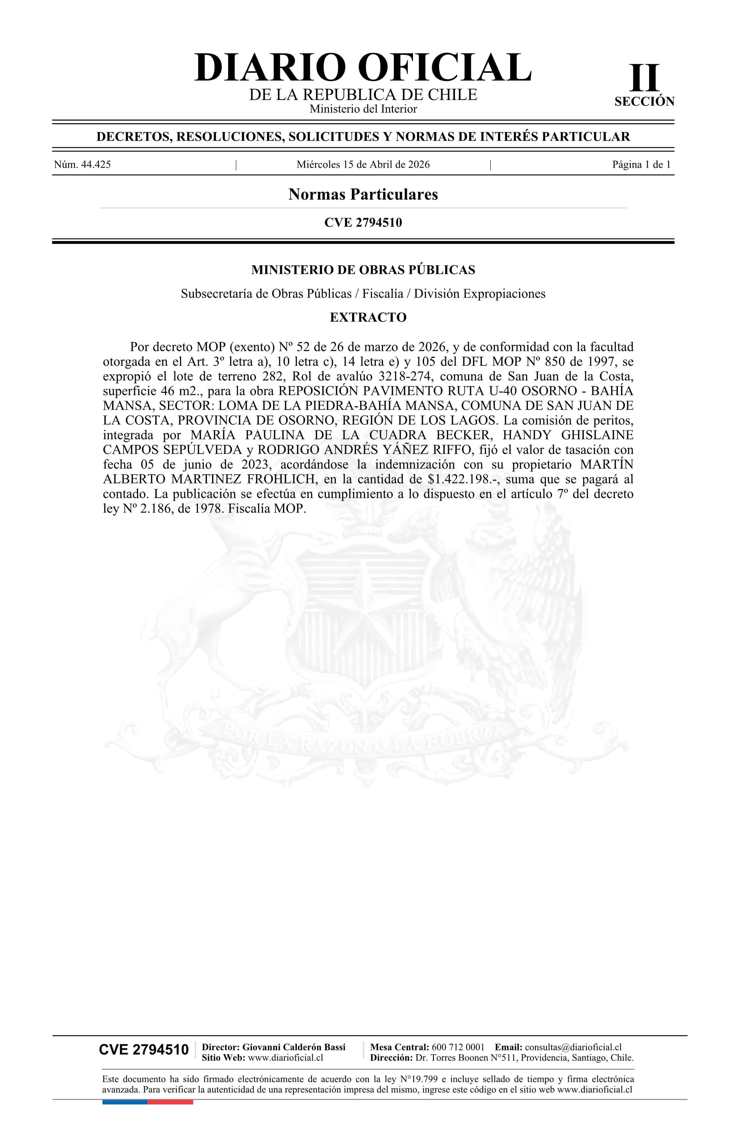 Extracto de decreto exento número 52, de 2026.- Martínez Frohlich Martín Alberto 15-04-2026 Diario Oficial Edición Electrónica |