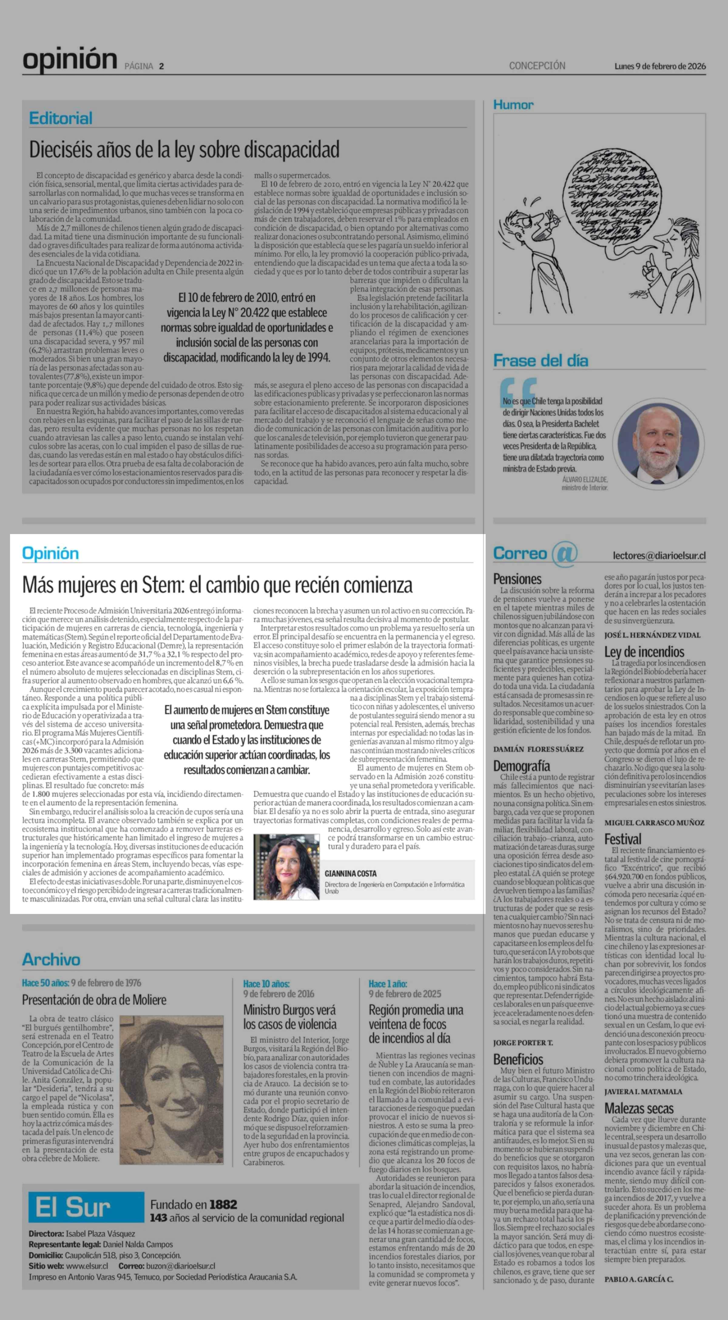 Columnas de Opinión: Más mujeres en Stem: el cambio que recién comienza 09-02-2026 El Sur |