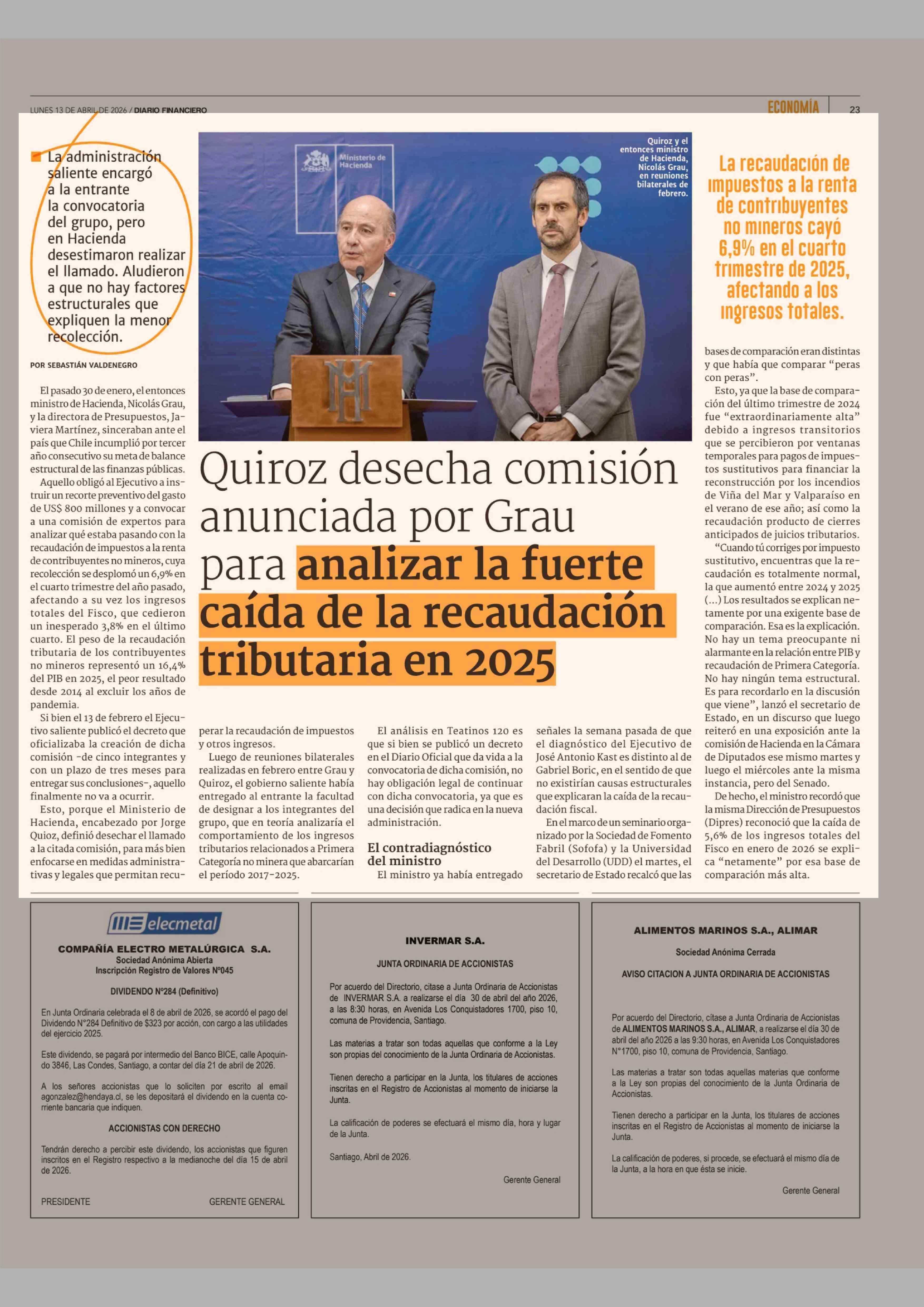 Quiroz desecha comisión anunciada por Grau para analizar la fuerte caída de la recaudación tributaria en 2025 13-04-2026 Diario Financiero |