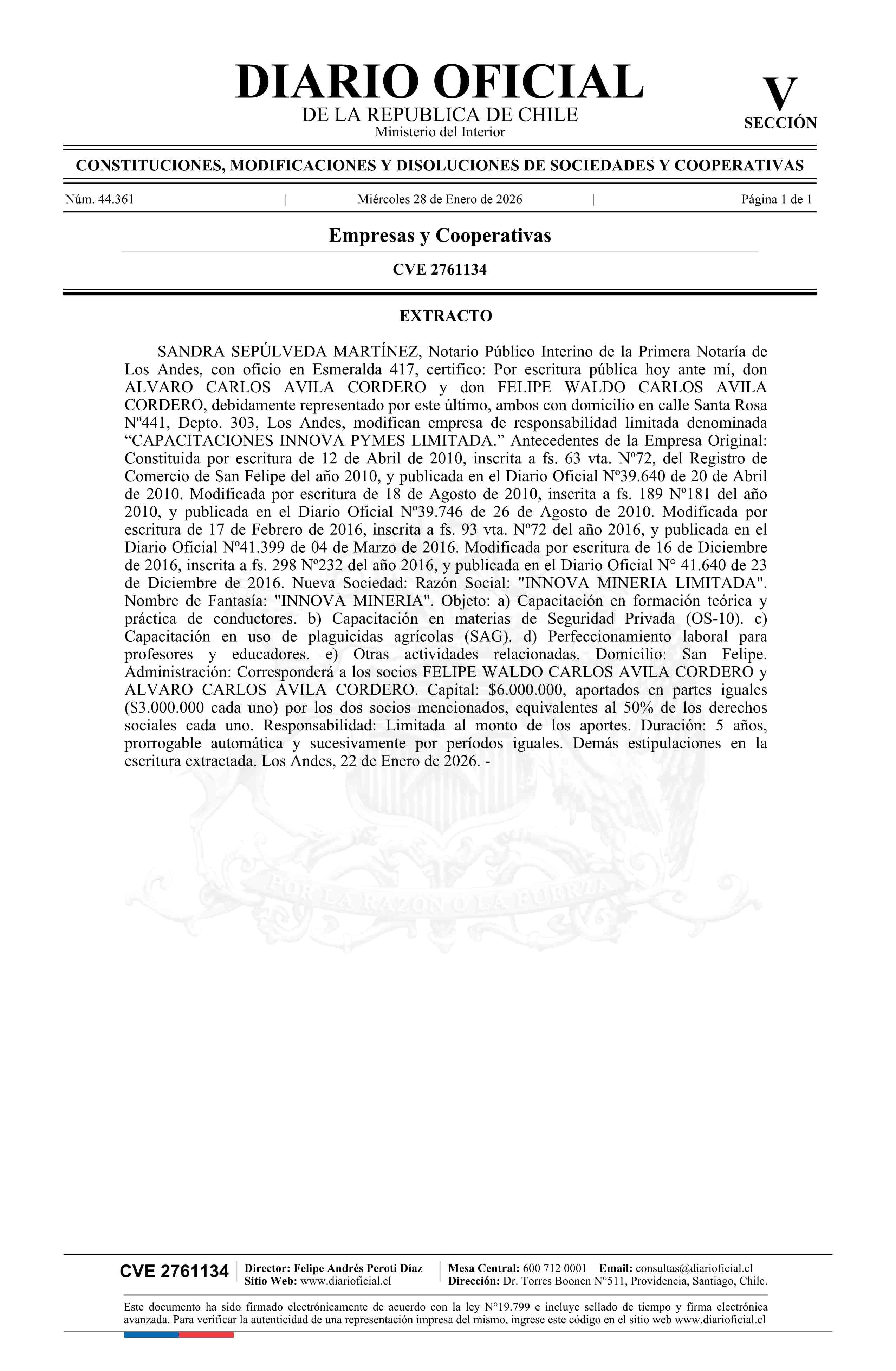 CAPACITACIONES INNOVA PYMES LIMITADA 76.102.946-0* 28-01-2026 Diario Oficial Edición Electrónica |