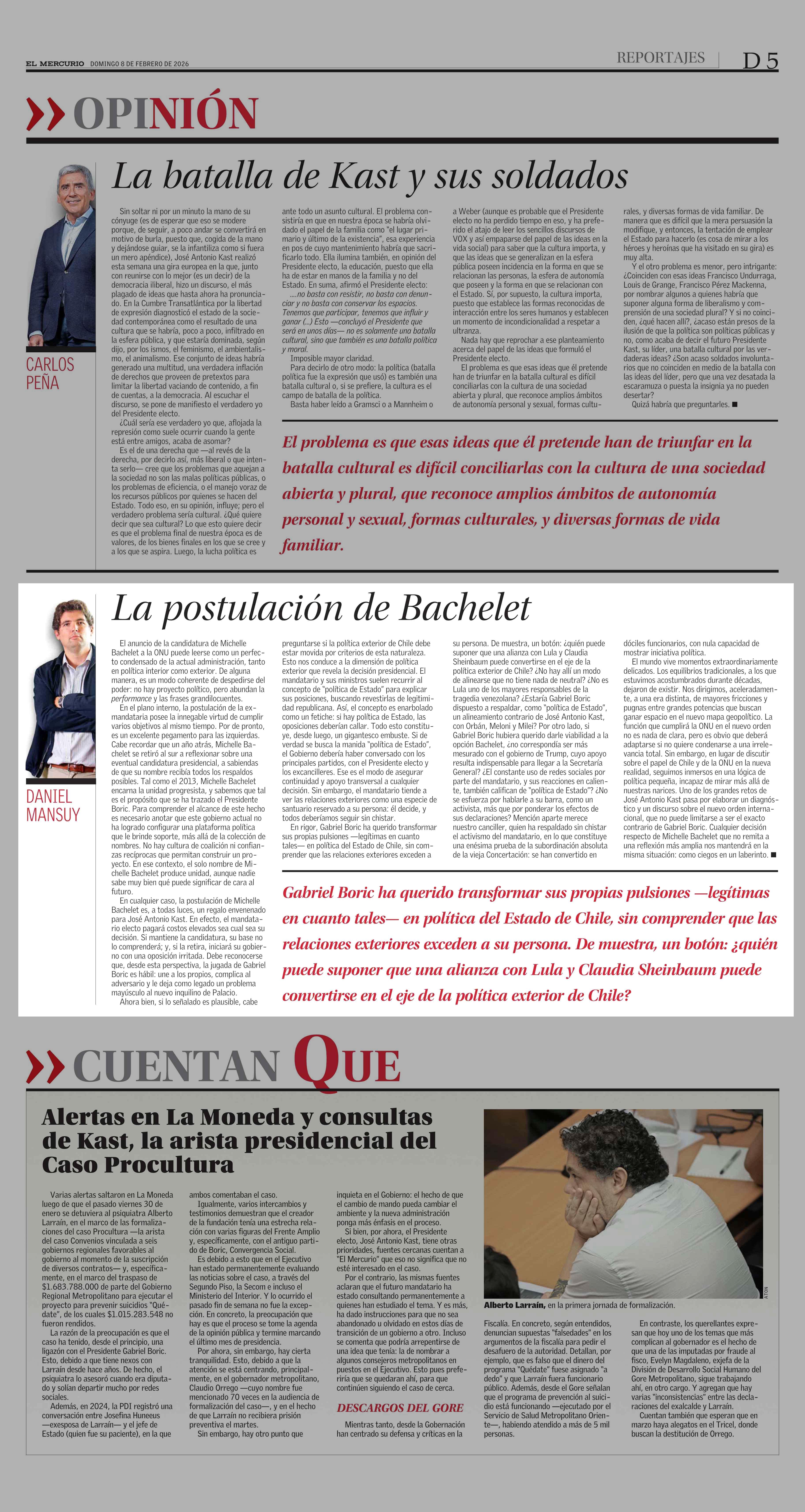 Columnas de Opinión: La postulación de Bachelet 08-02-2026 El Mercurio |