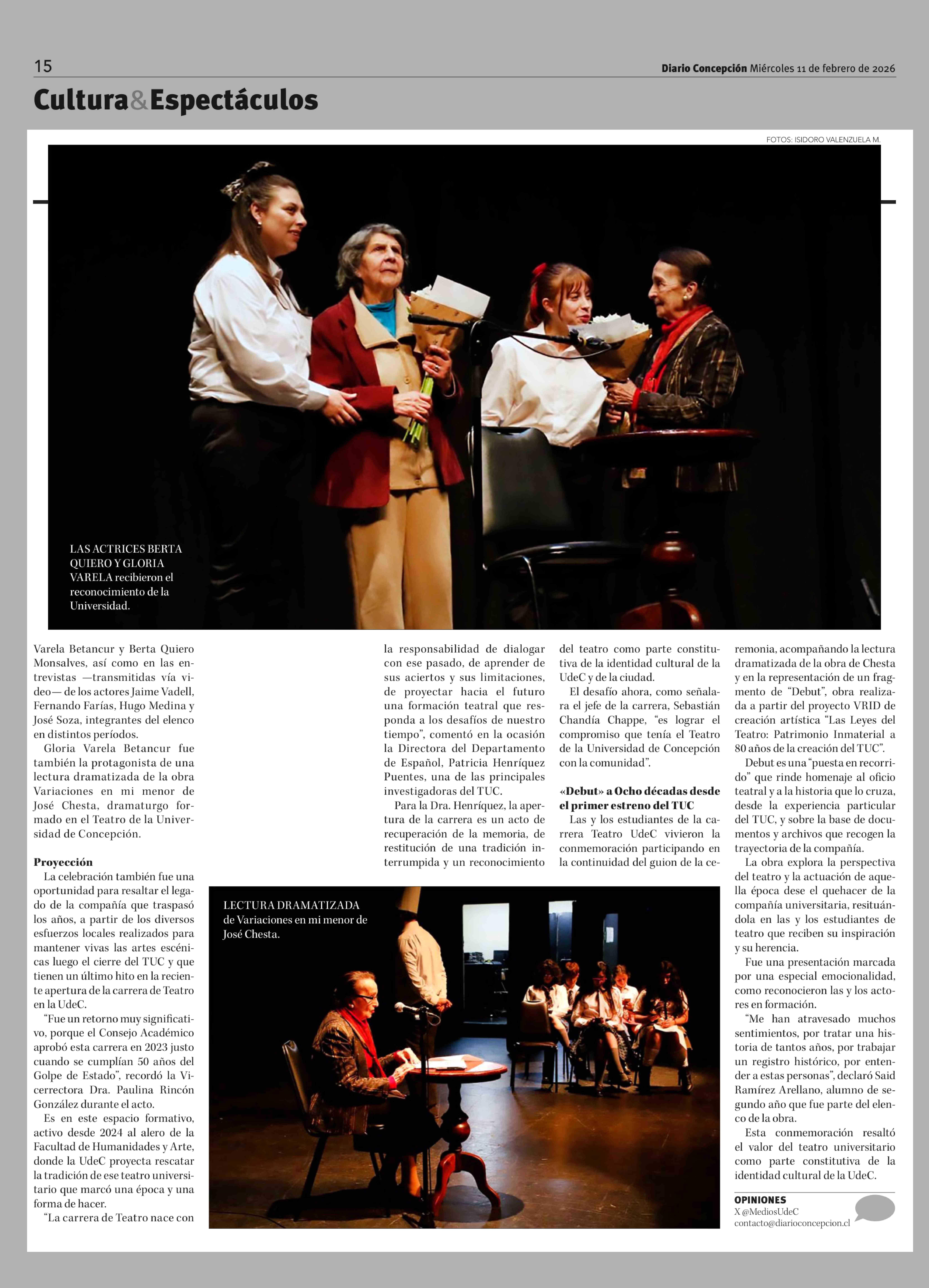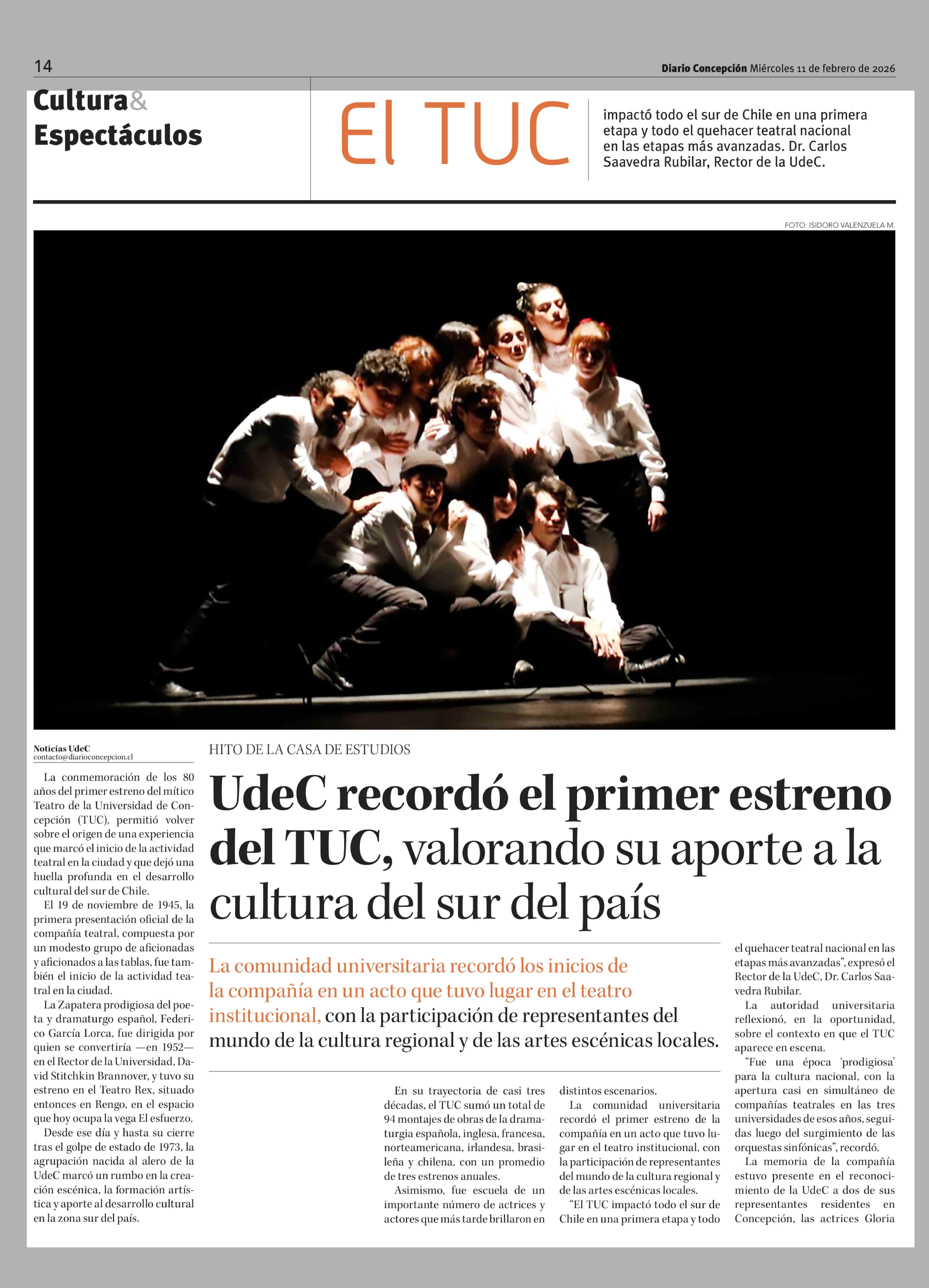 UdeC recordó el primer estreno del TUC, valorando su aporte a la cultura del sur del país 11-02-2026 Diario Concepción |