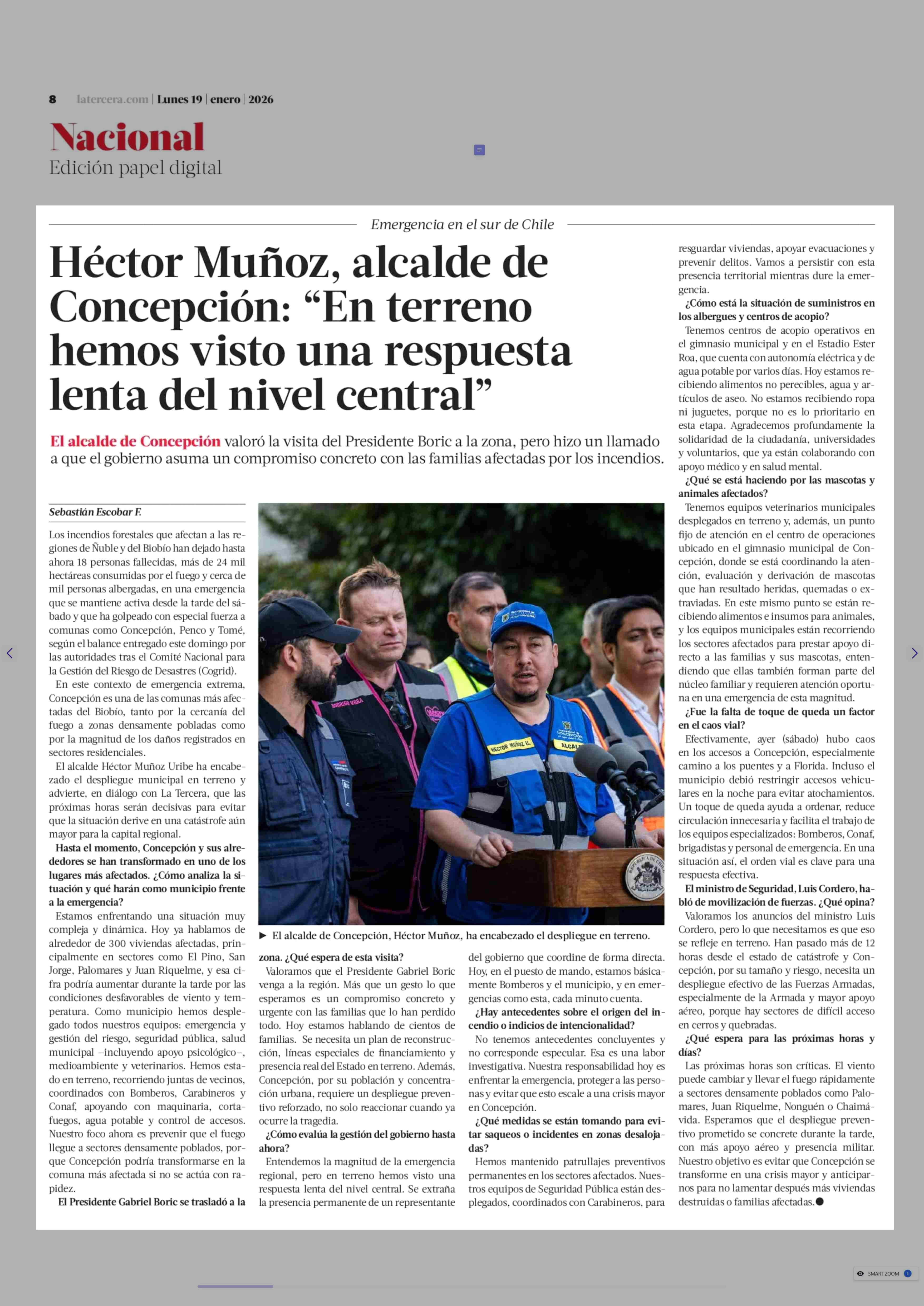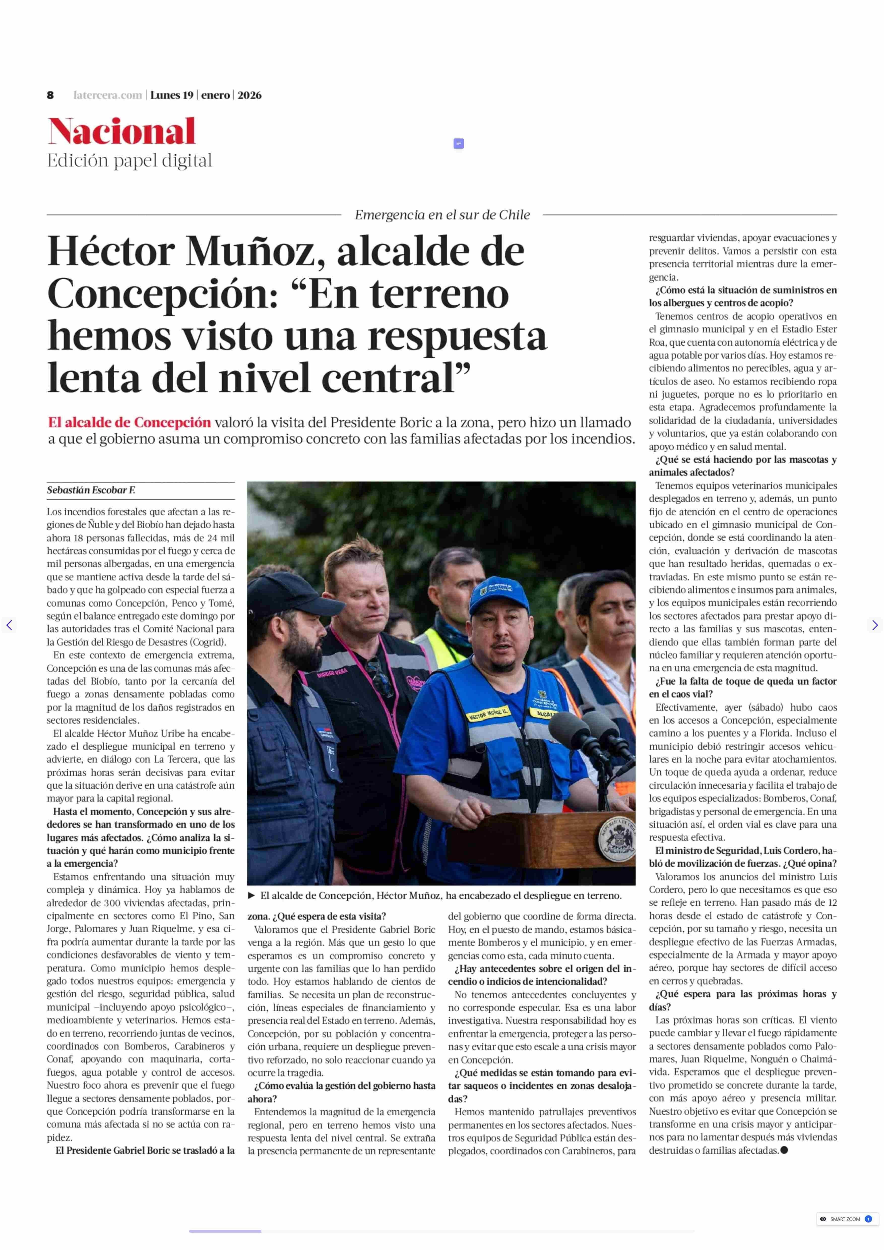 Héctor Muñoz, alcalde de Concepción: "En terreno hemos visto una respuesta lenta del nivel central" 19-01-2026 La Tercera |