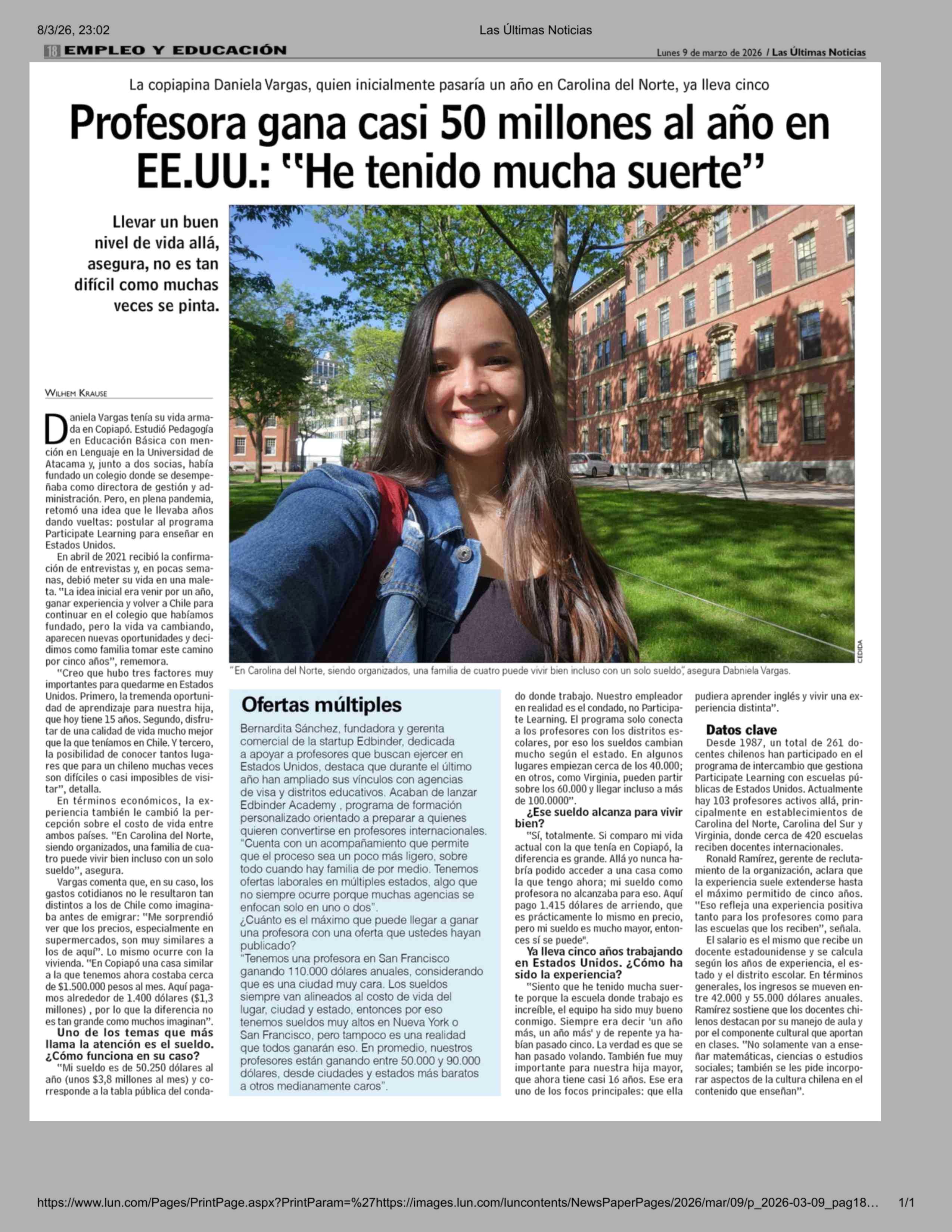 Profesora gana casi 50 millones al año en EE.UU .: "He tenido mucha suerte" 09-03-2026 Las Últimas Noticias |