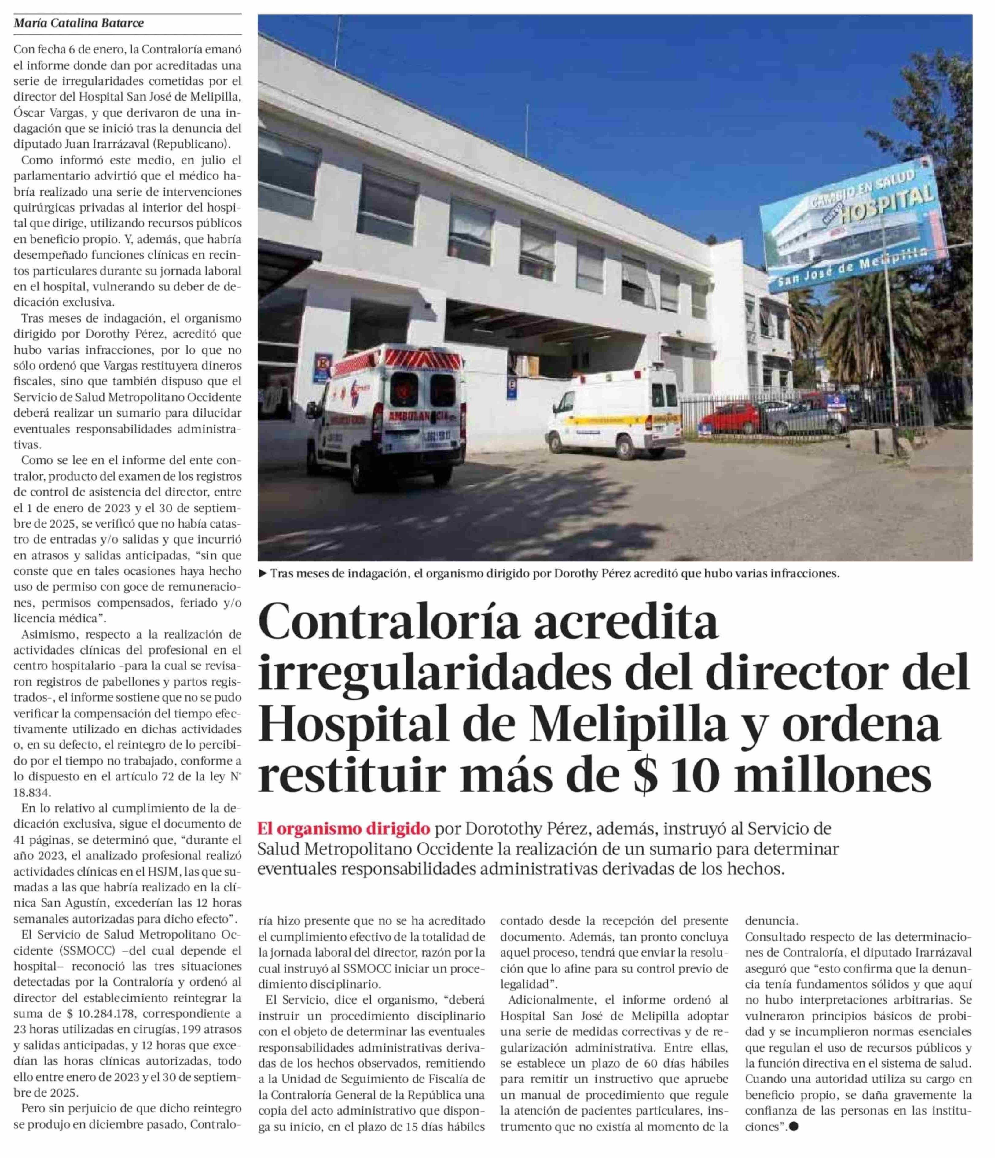 Contraloría acredita irregularidades del director del Hospital de Melipilla y ordena restituir más de $ 10 millones 14-01-2026 La Tercera |