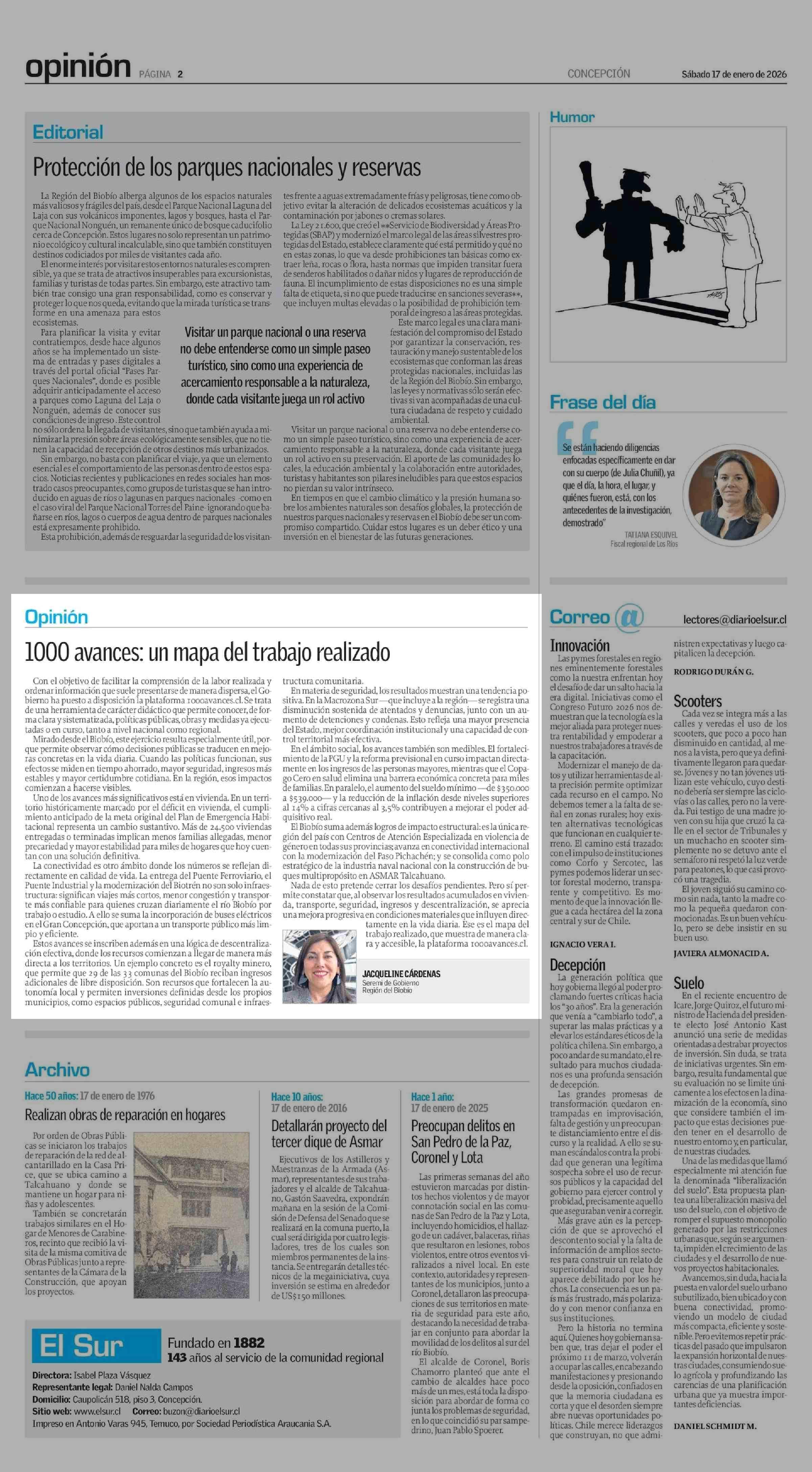 Columnas de Opinión: 1000 Avances: un mapa del trabajo realizado 17-01-2026 El Sur |