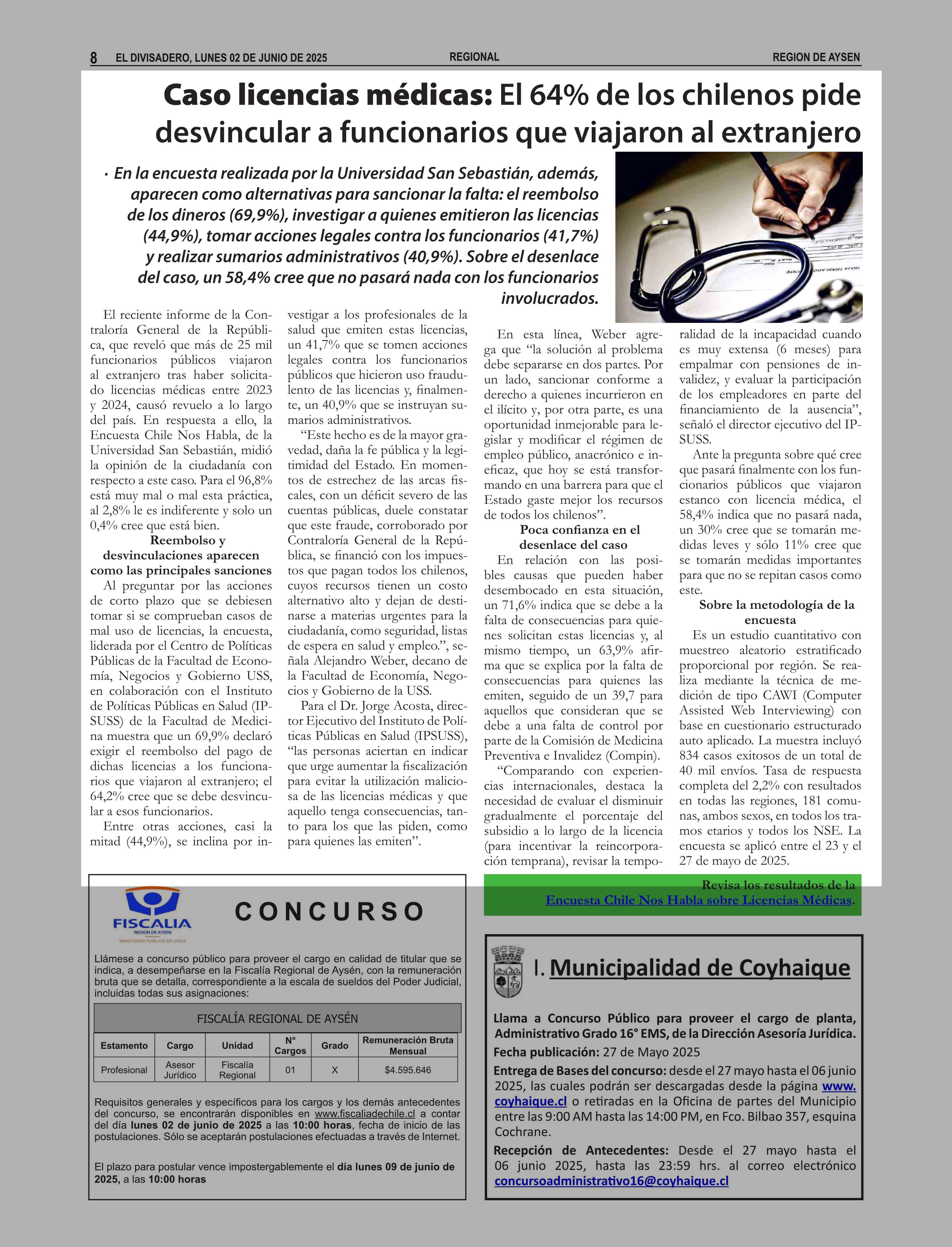 Caso licencias médicas: El 64% de los chilenos pide desvincular a funcionarios que viajaron al extranjero 02-06-2025 El Divisadero |