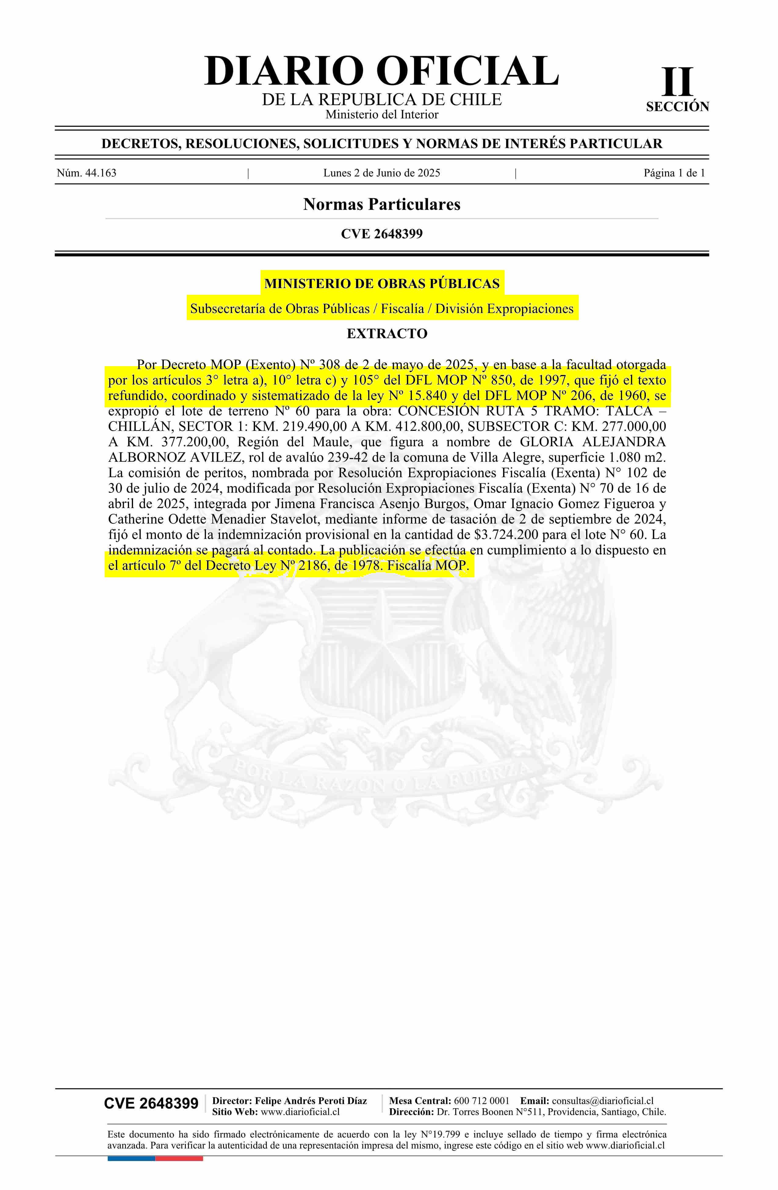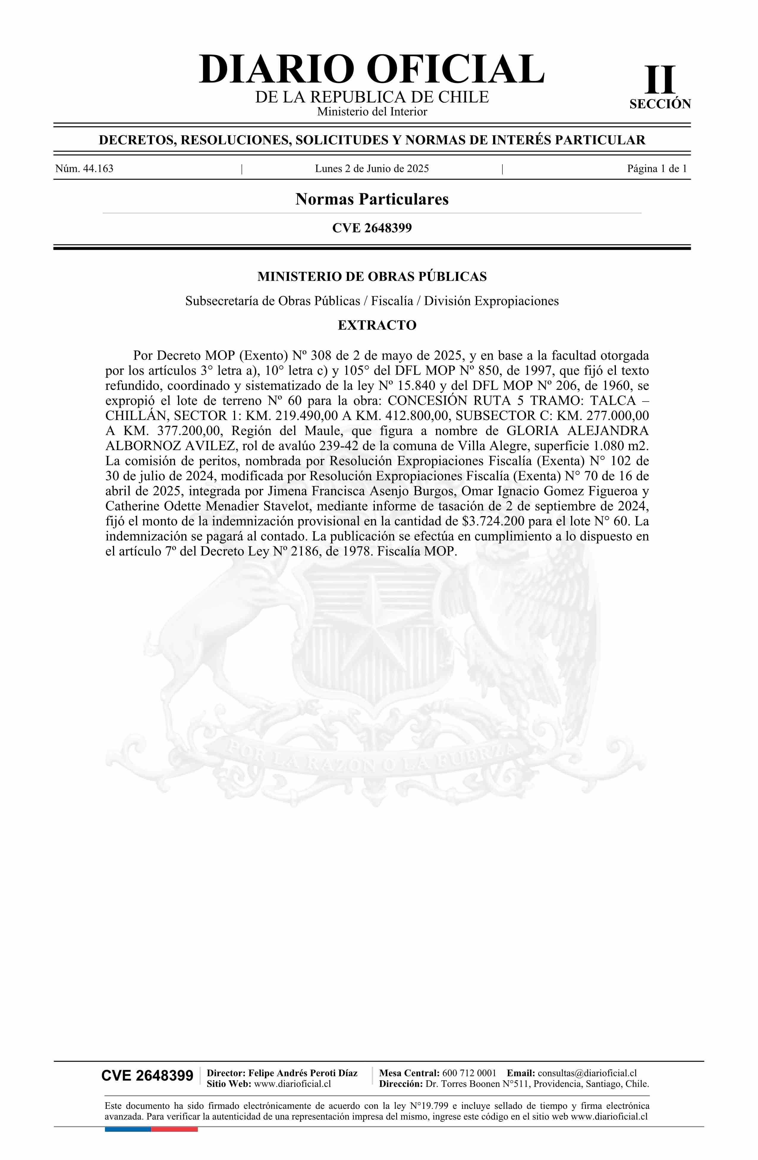 Extracto de decreto exento número 308, de 2025.- Albornoz Avilez Gloria Alejandra 02-06-2025 Diario Oficial Edición Electrónica |