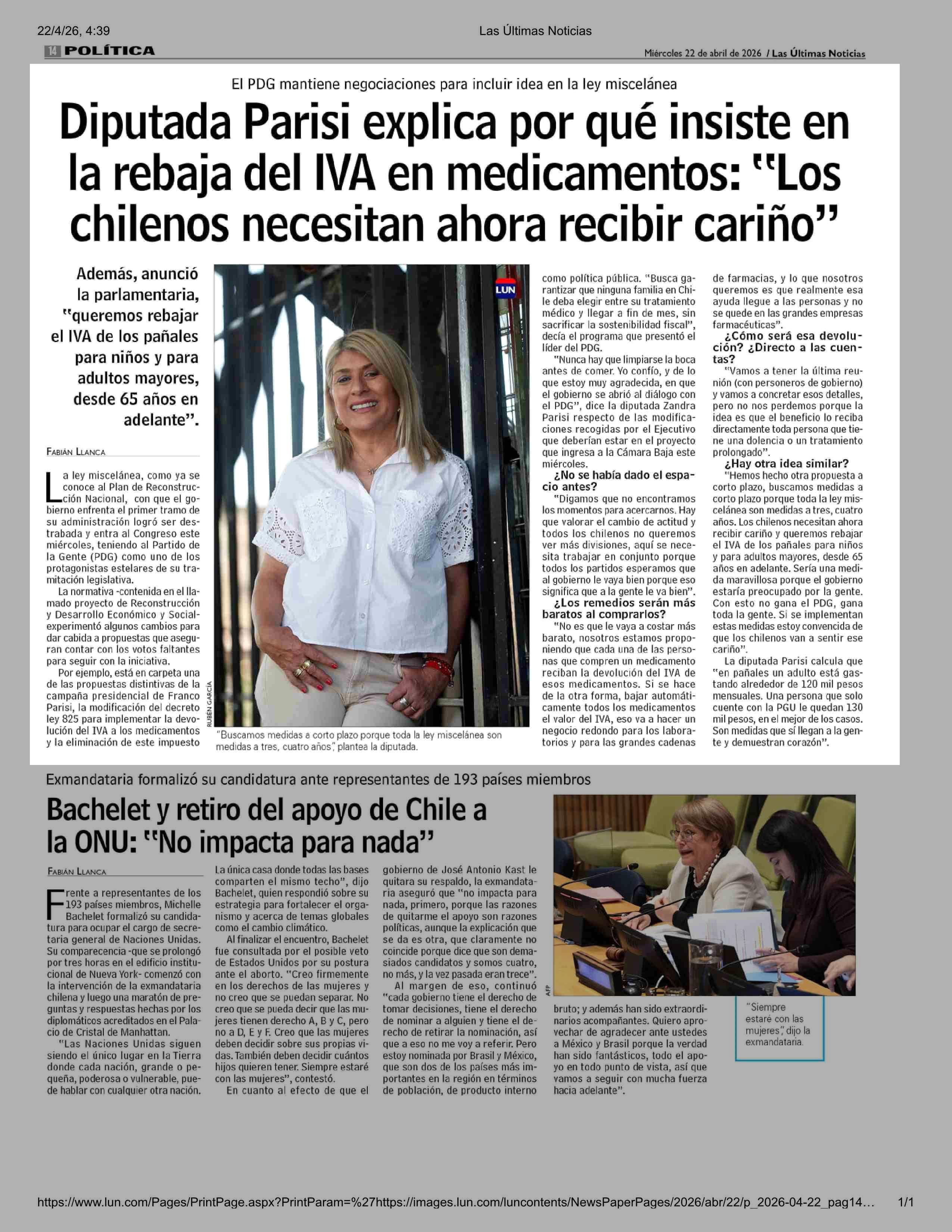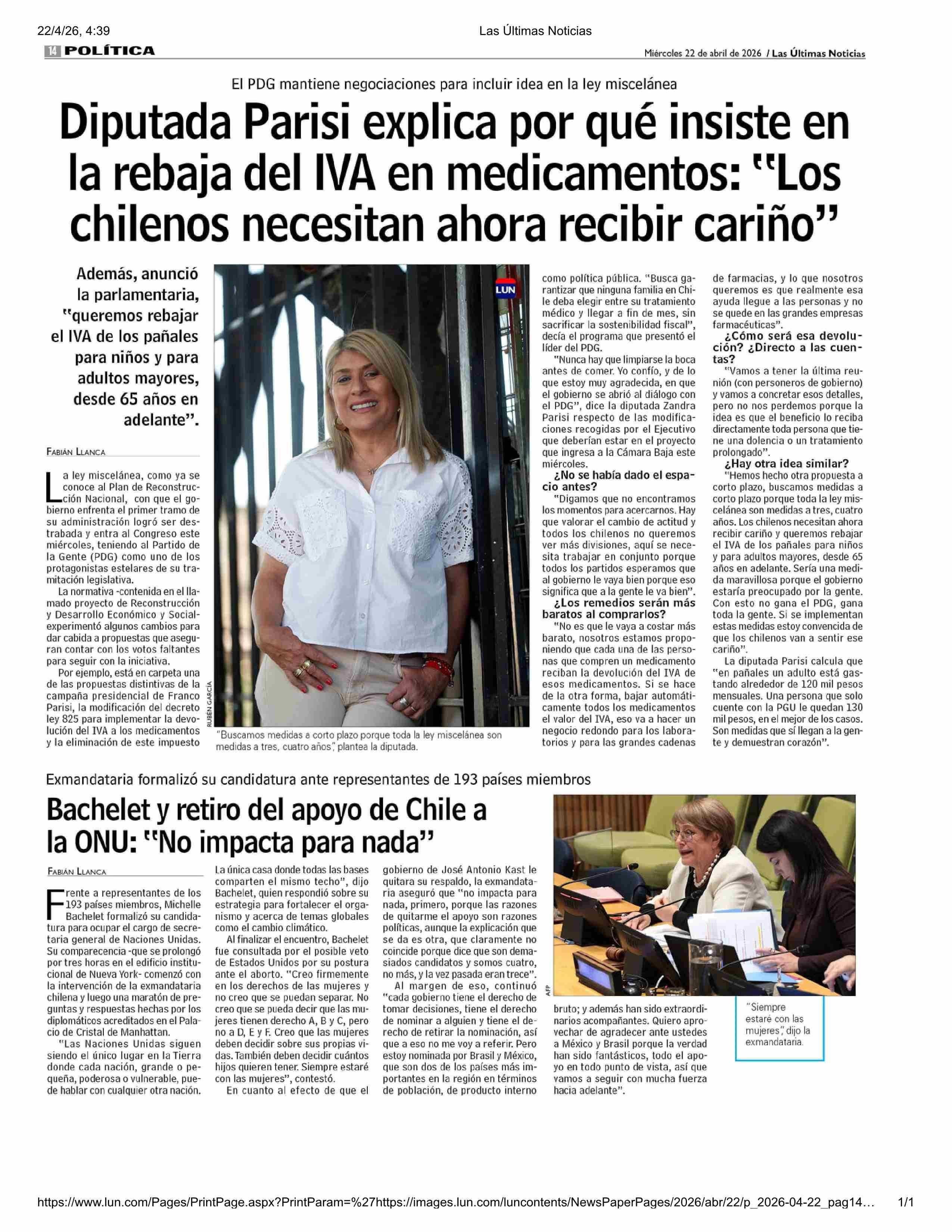 Diputada Parisi explica por qué insiste en la rebaja del IVA en medicamentos: “Los chilenos necesitan ahora recibir cariño” 22-04-2026 Las Últimas Noticias |