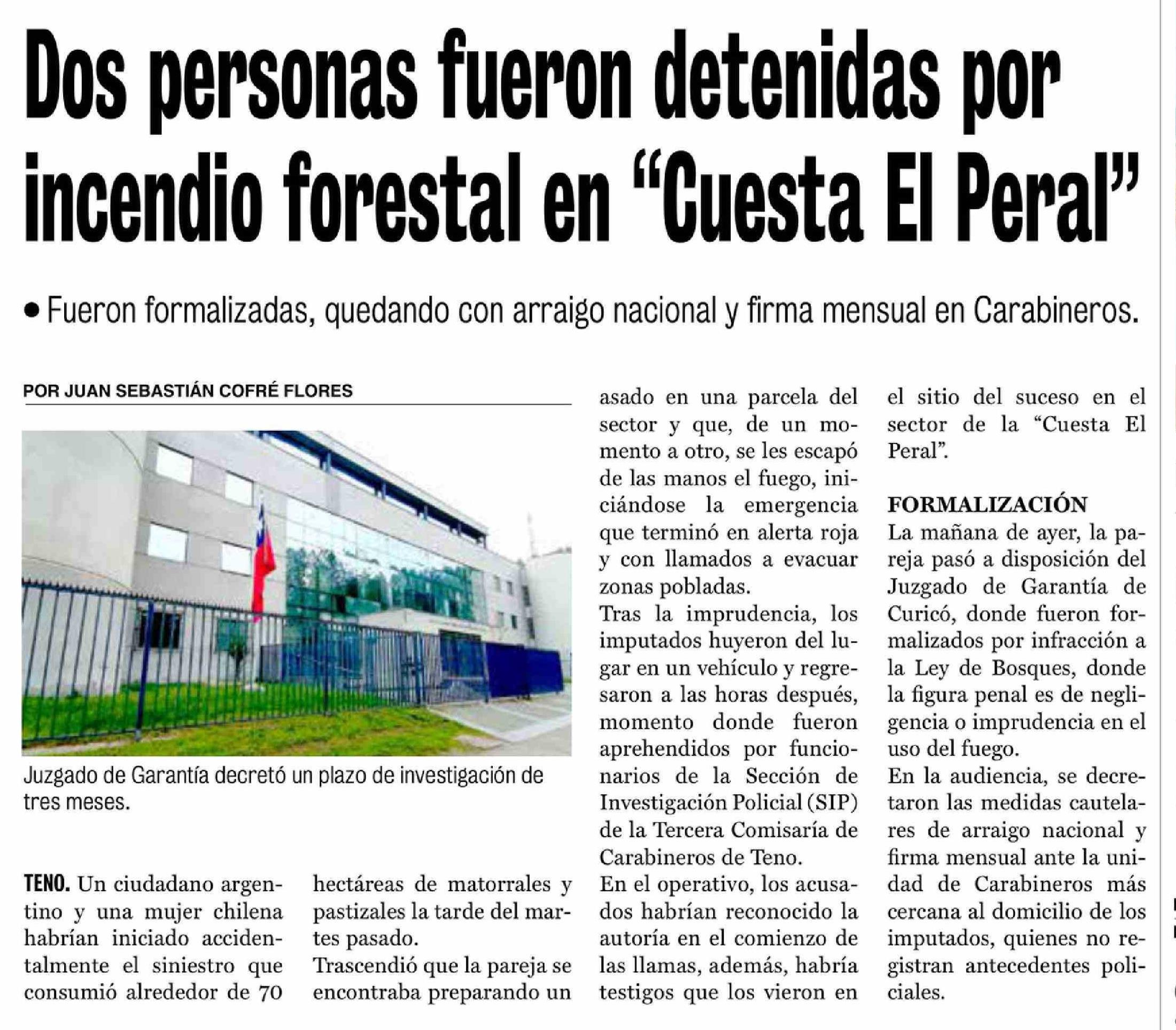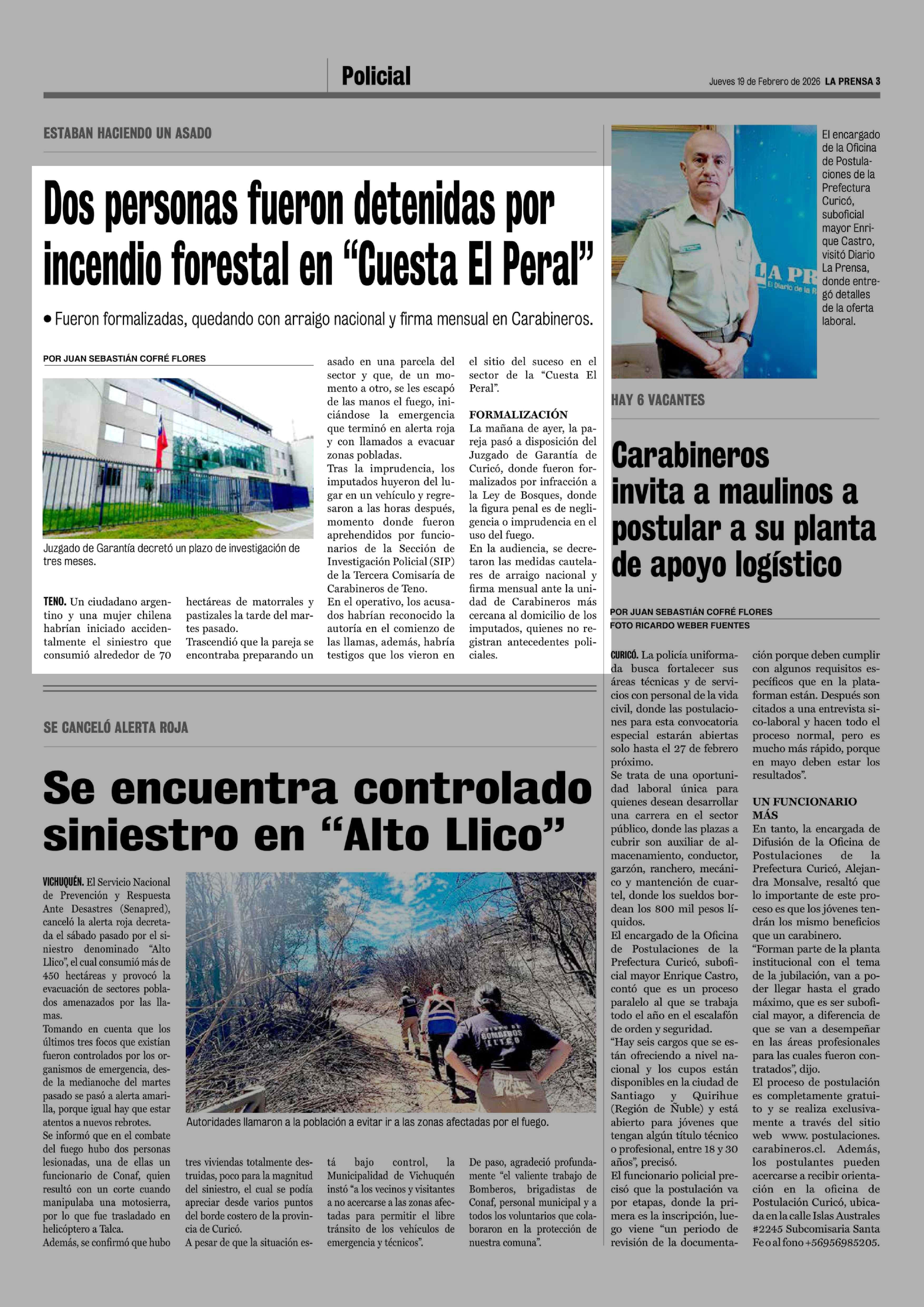 Dos personas fueron detenidas por incendio forestal en "Cuesta El Peral" 19-02-2026 La Prensa de Curicó |