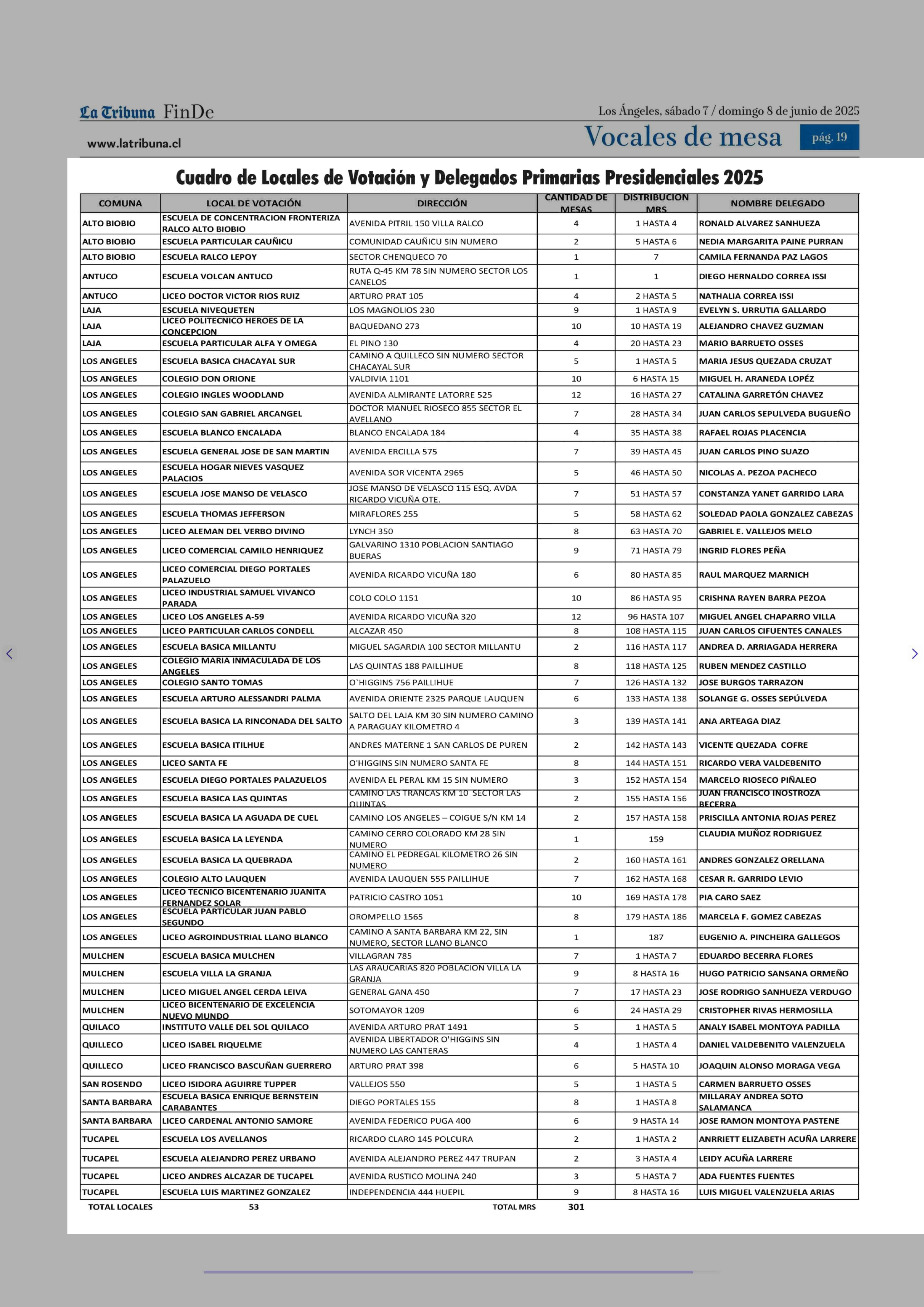 Cuadro de Locales de Votación y Delegados Primarias Presidenciales 2025