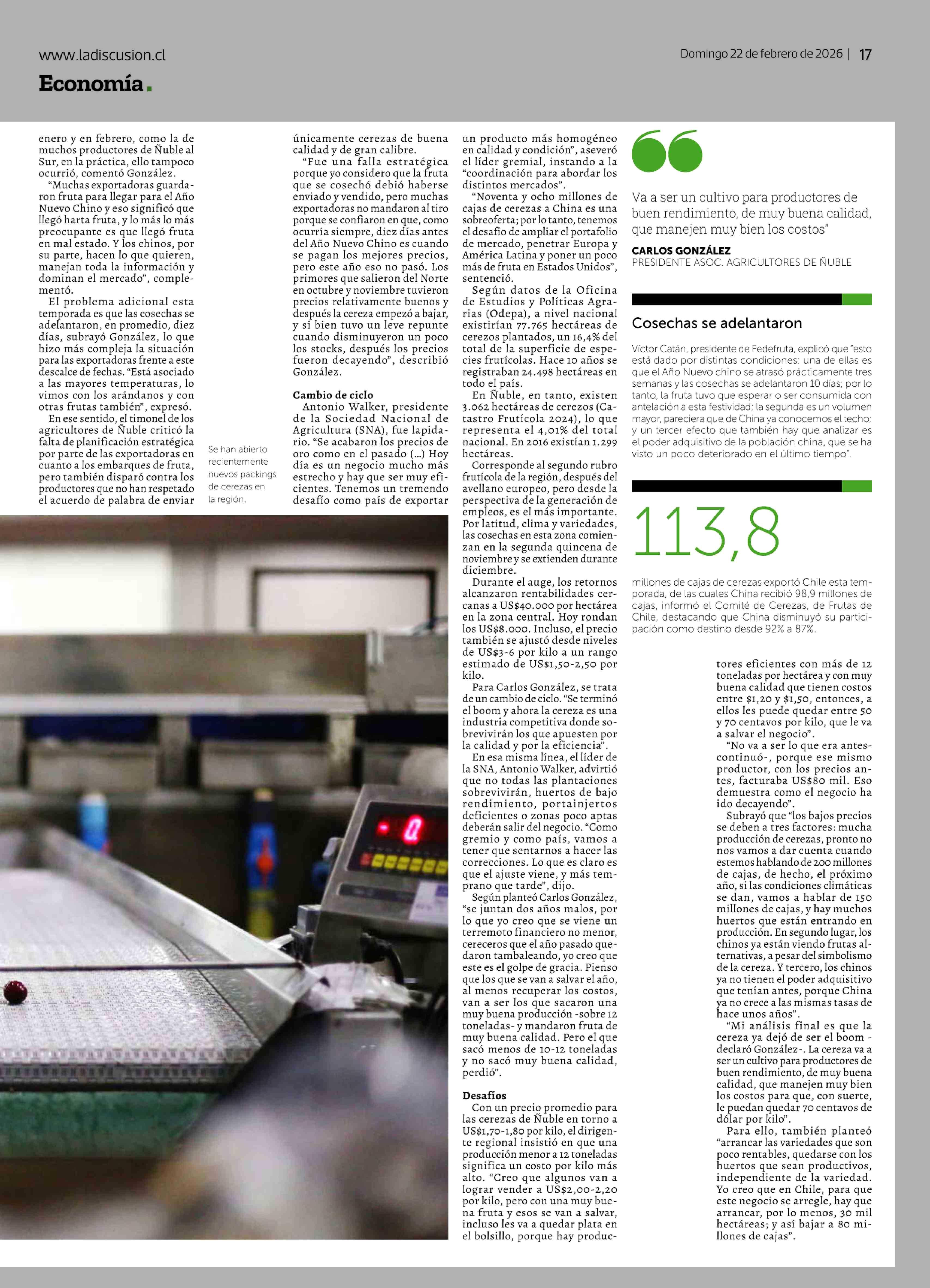 Título: Gremio agrícola advierte cambio en ciclo de cerezas tras compleja temporada