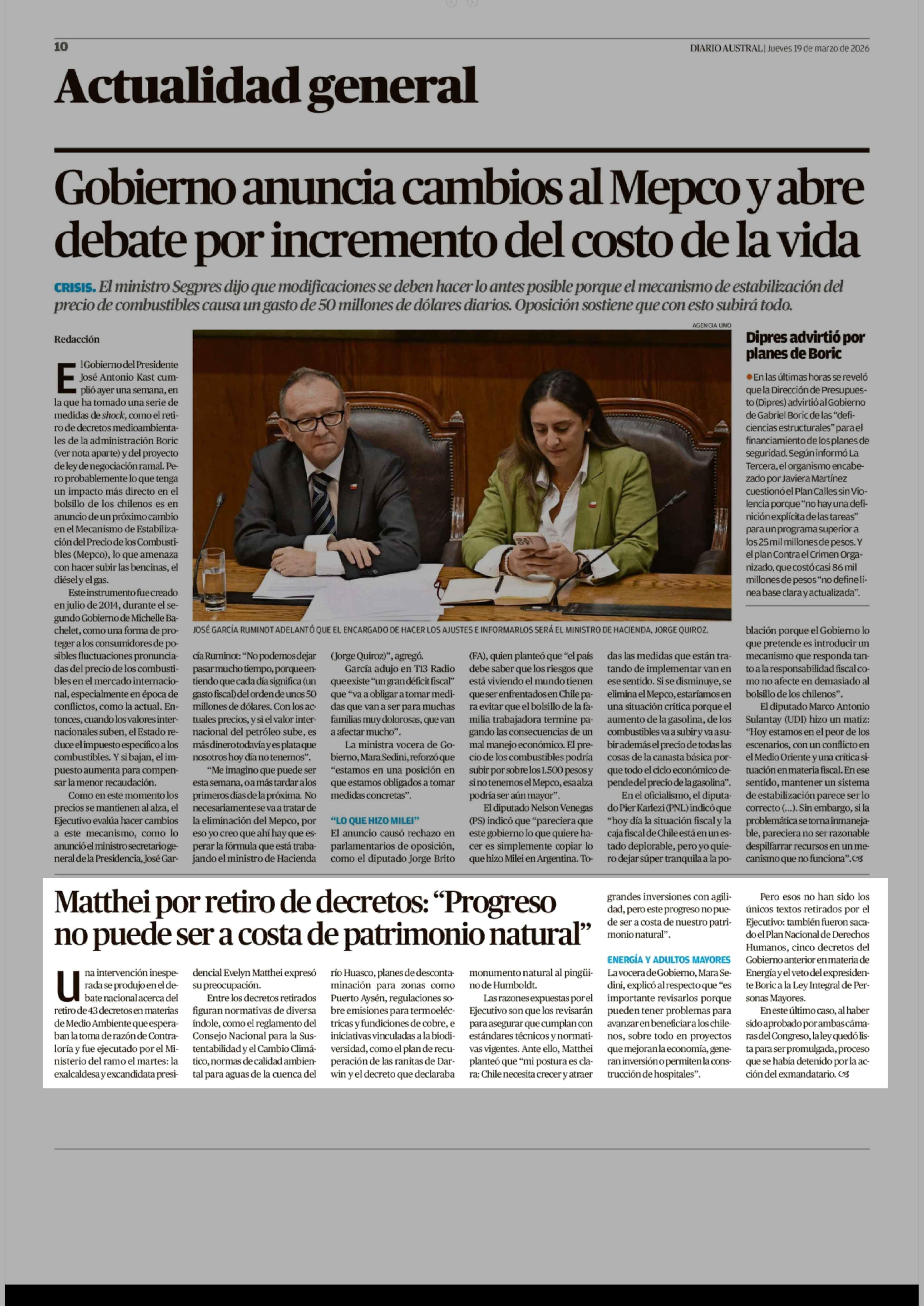 Matthei por retiro de decretos: "Progreso no puede ser a costa de patrimonio natural" 19-03-2026 Diario Austral Región de Los Ríos |