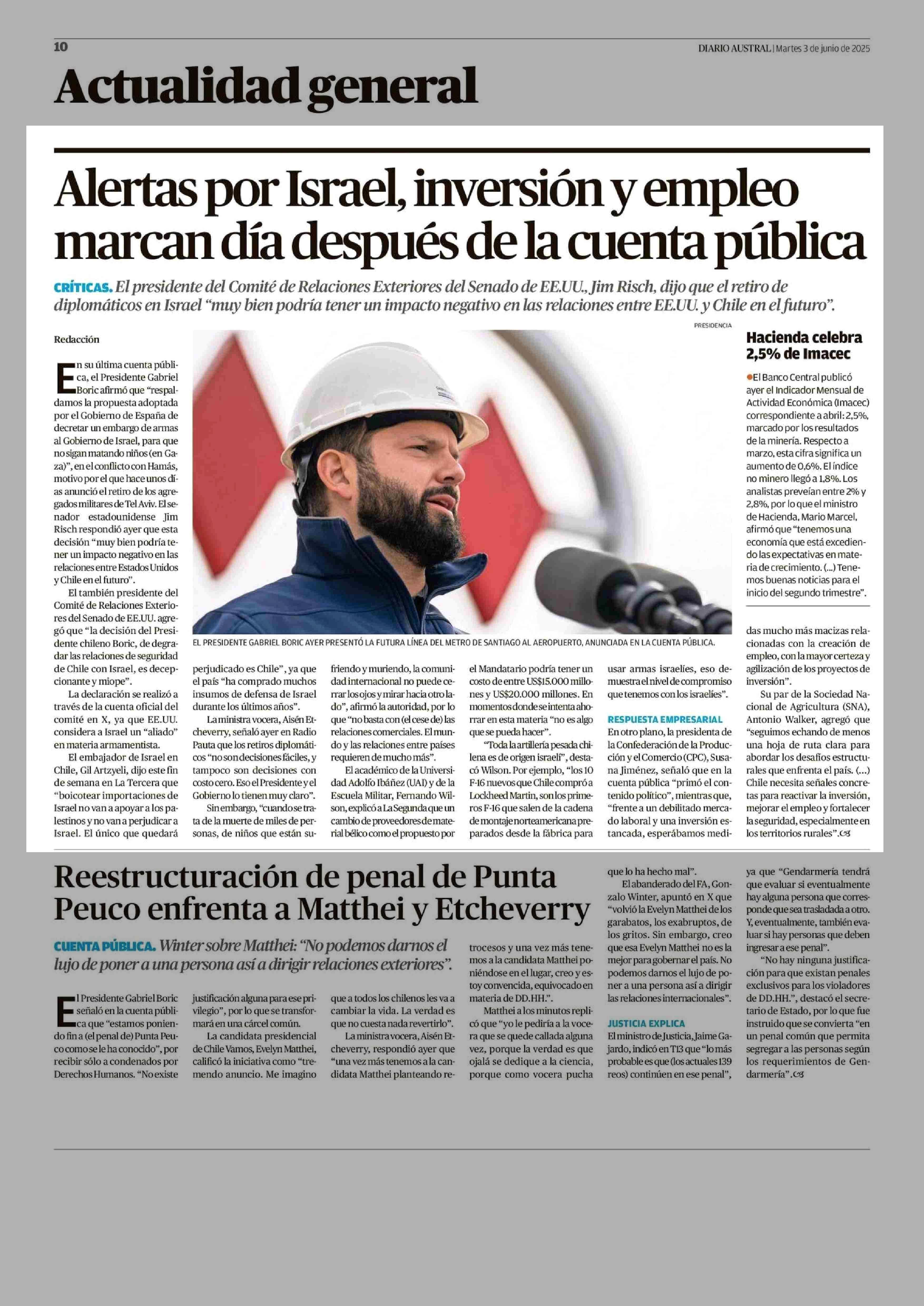 Alertas por Israel, inversión y empleo marcan día después de la cuenta pública 03-06-2025 Diario Austral Región de Los Ríos |