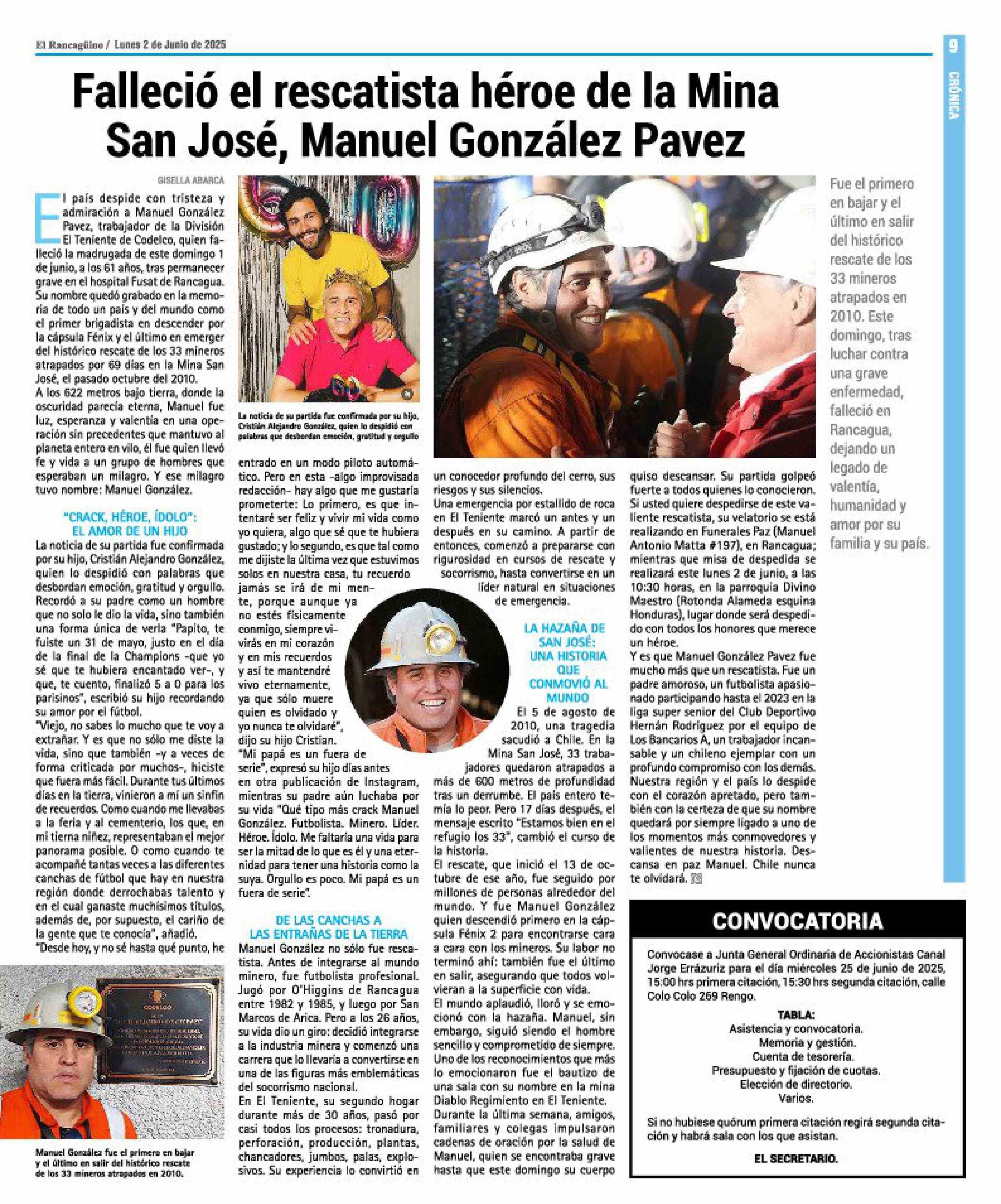 Falleció el rescatista héroe de la Mina San José. Manuel González Pavez 02-06-2025 El Rancagüino |